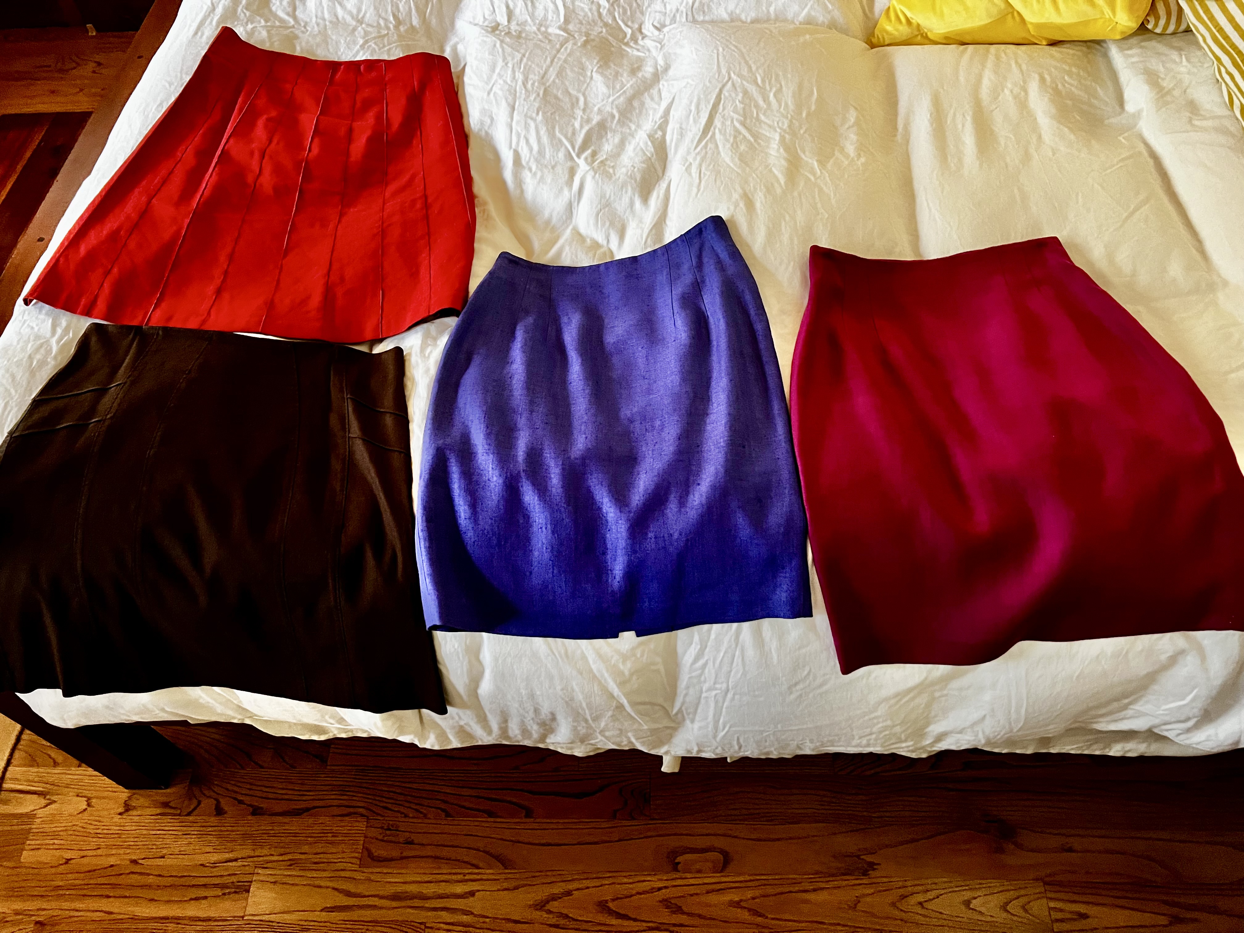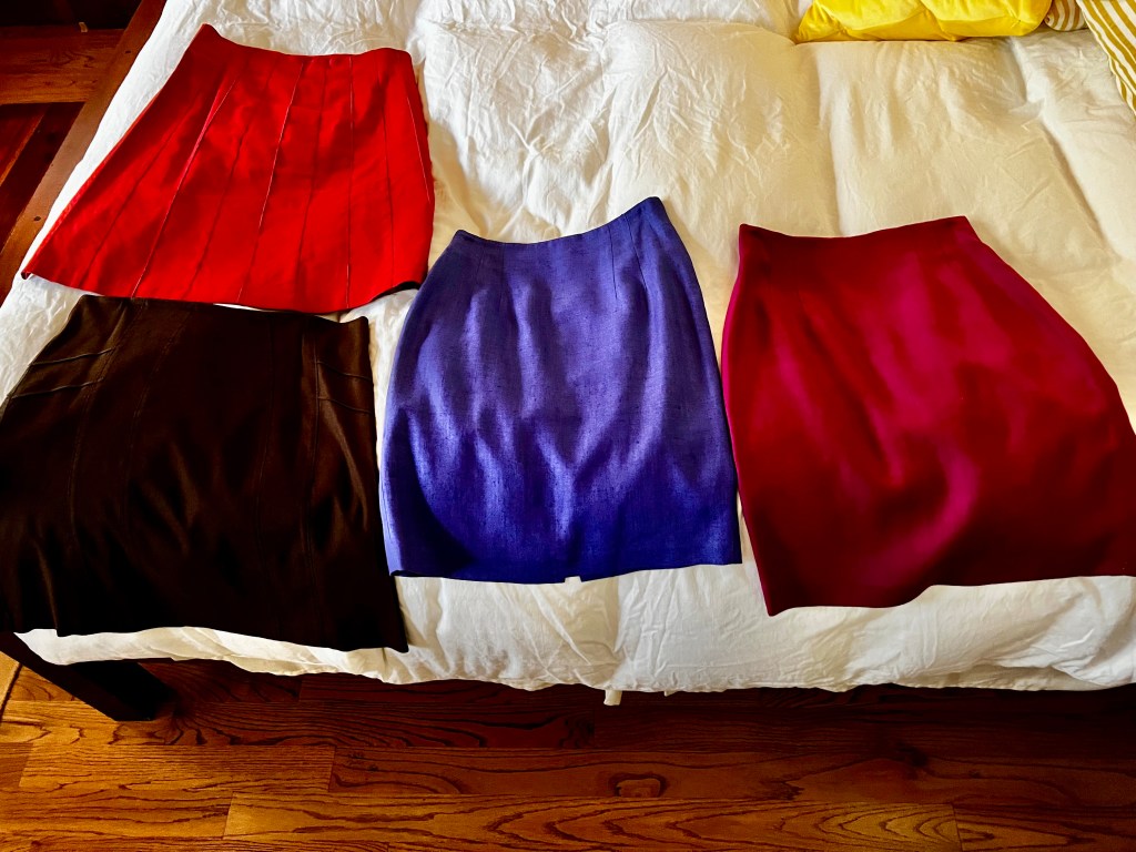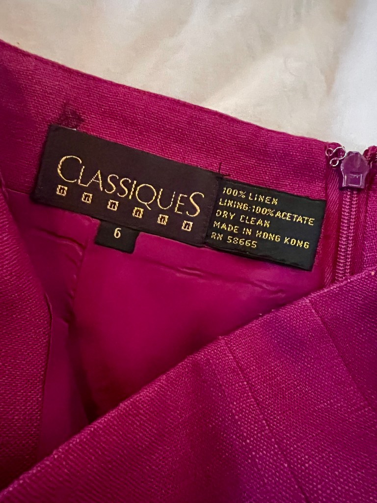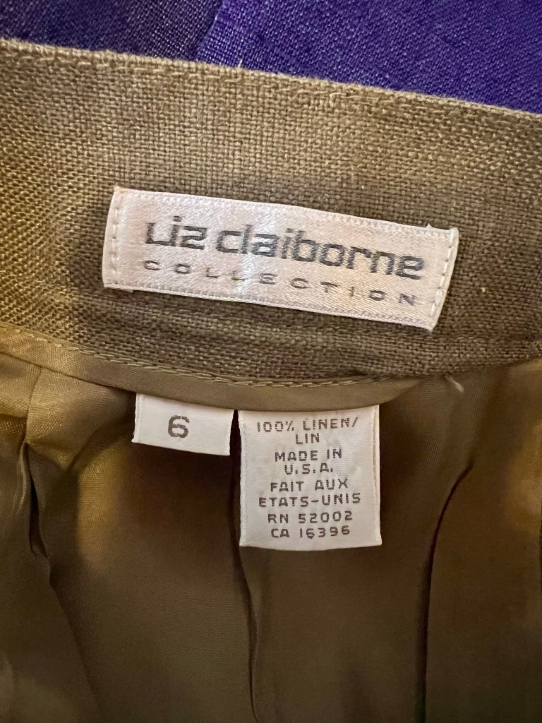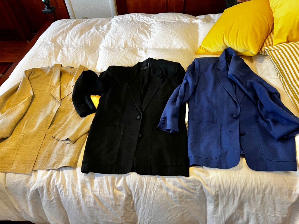 Today’s haul comprised work clothes I’ll never wear again. Even if I did still work, I’d never fit into these things. Somewhere back in the early 90s, I must have lost a bunch of weight and then ran out and bought a bunch of clothes. Probably as an incentive to keep the weight off. Lots of silk and lots of linen.. pencil skirts and boyfriend blazers. This was overkill when it came to working in our little nonprofit office in Davis, but when I was on the national board for the Alliance for Community Media and traveled a lot.. well, linen pencil skits and boyfriend blazers were just the thing. Ms. Fancy Pants.