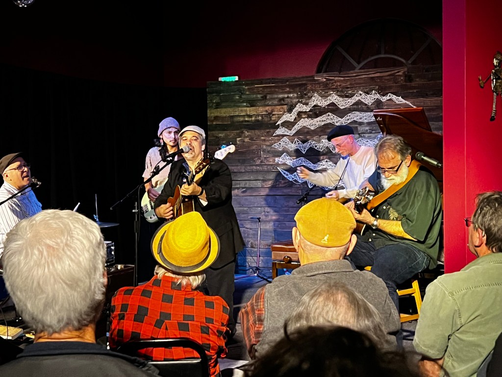 L to R: Nick Carvajal (drummer and guitar teacher), Brendon Tull (bass), Dave Nachmanoff (guitar, piano), a harmonica guy who played for two songs (and was amazing), and Martin Lewis (guitar).