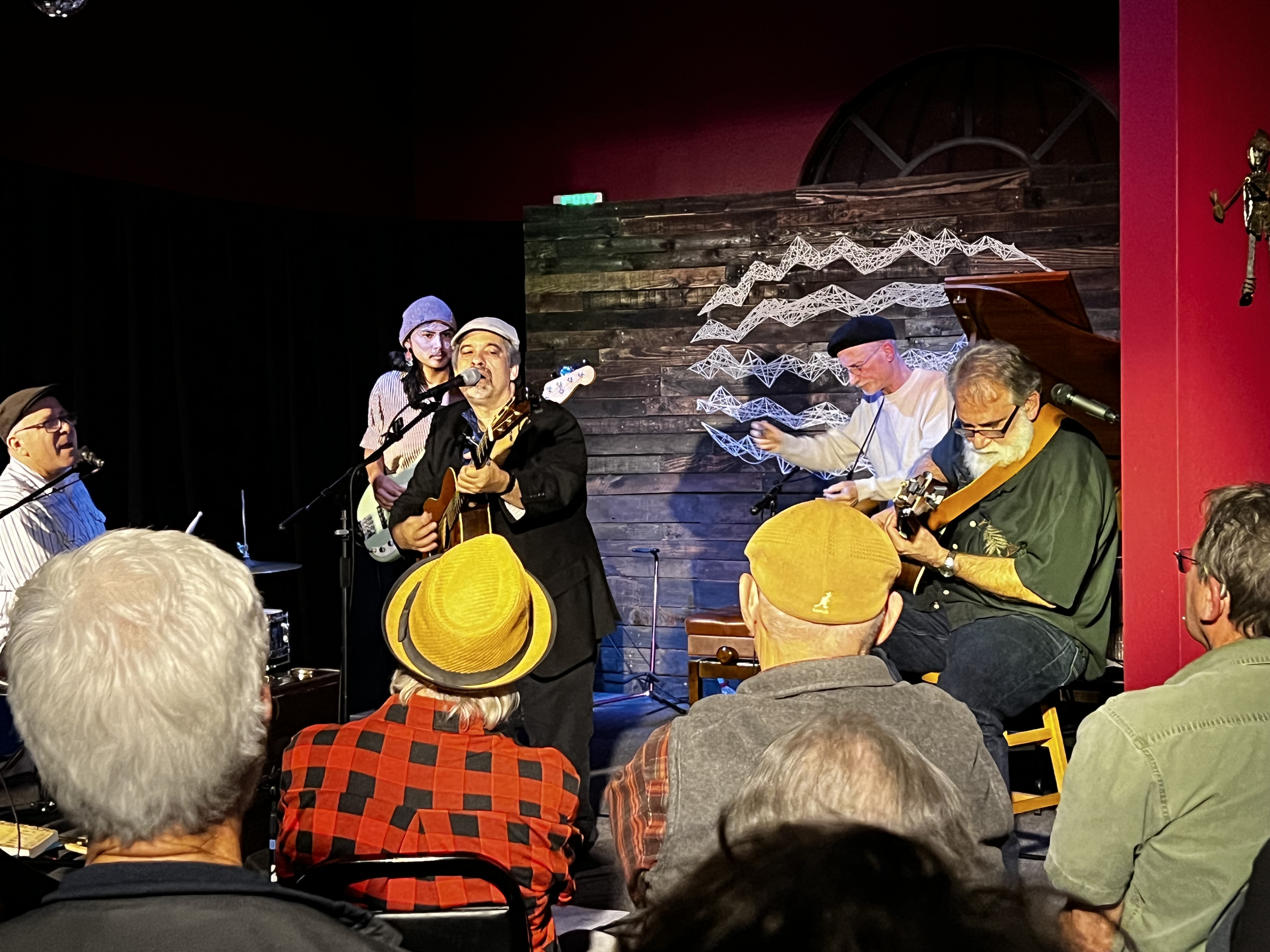 L to R: Nick Carvajal (drummer and guitar teacher), Brendon Tull (bass), Dave Nachmanoff (guitar, piano), a harmonica guy who played for two songs (and was amazing), and Martin Lewis (guitar).