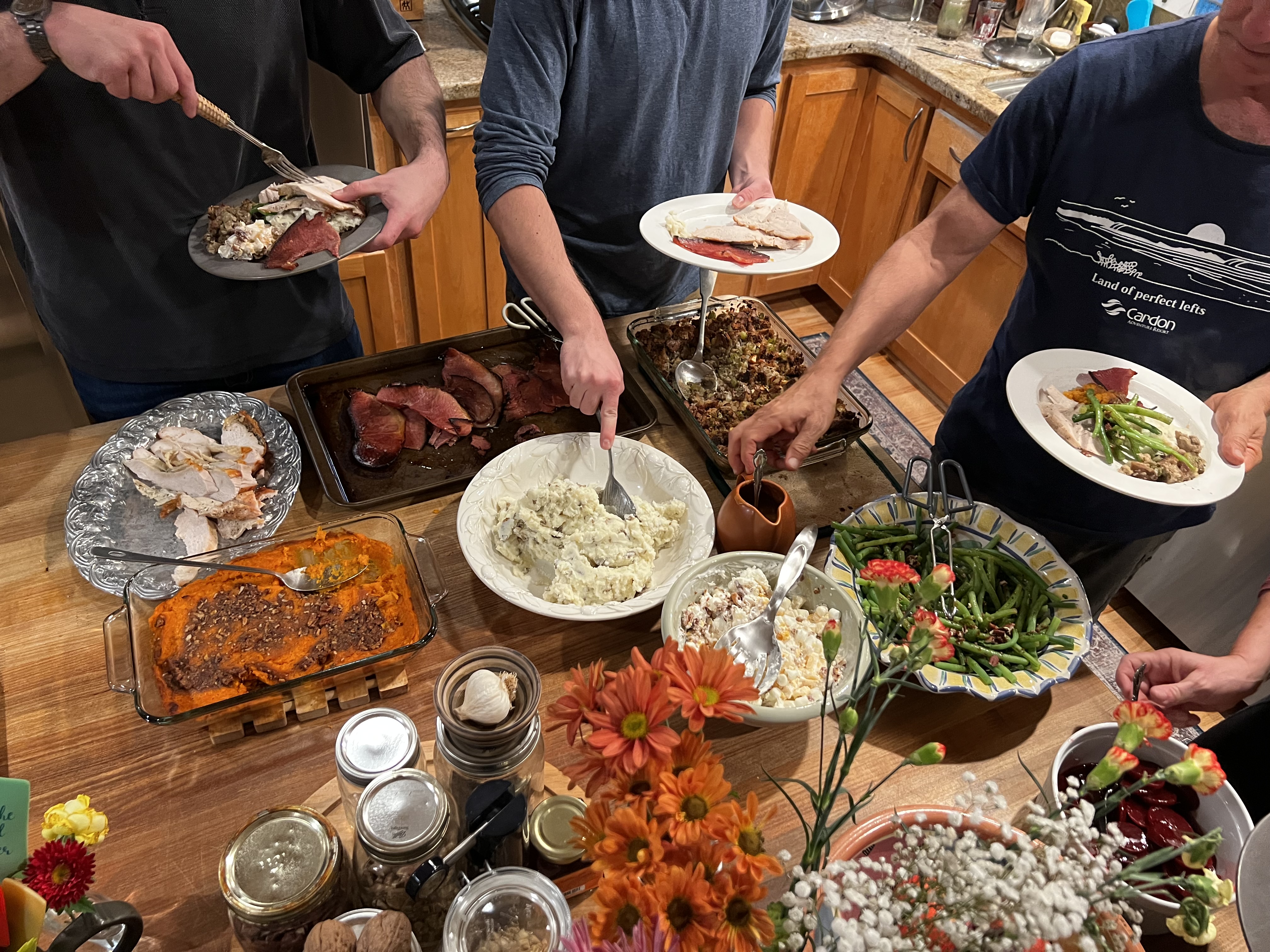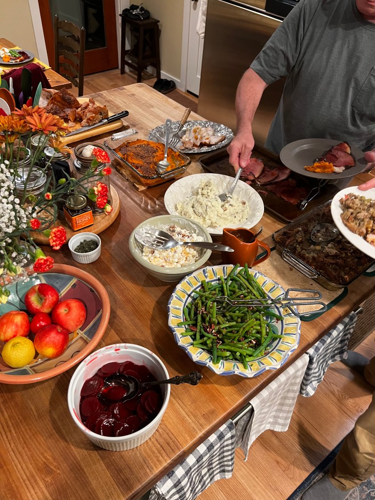 Serving it up! Turkey breast that Jim made (excellent, will take it out sooner next time), Honeybaked ham, dressing (I made, but didn’t turn out); mashed potatoes (Matt, solid!), sweet potatoes (Pam, very tasty); ambrosia (Pam again); Harvard beets (me, only Petersons eat them); cranberry sauce (me again, the usual); green beans (me, ready for a new version, less tart); Upper Crust bread (fantastic).
