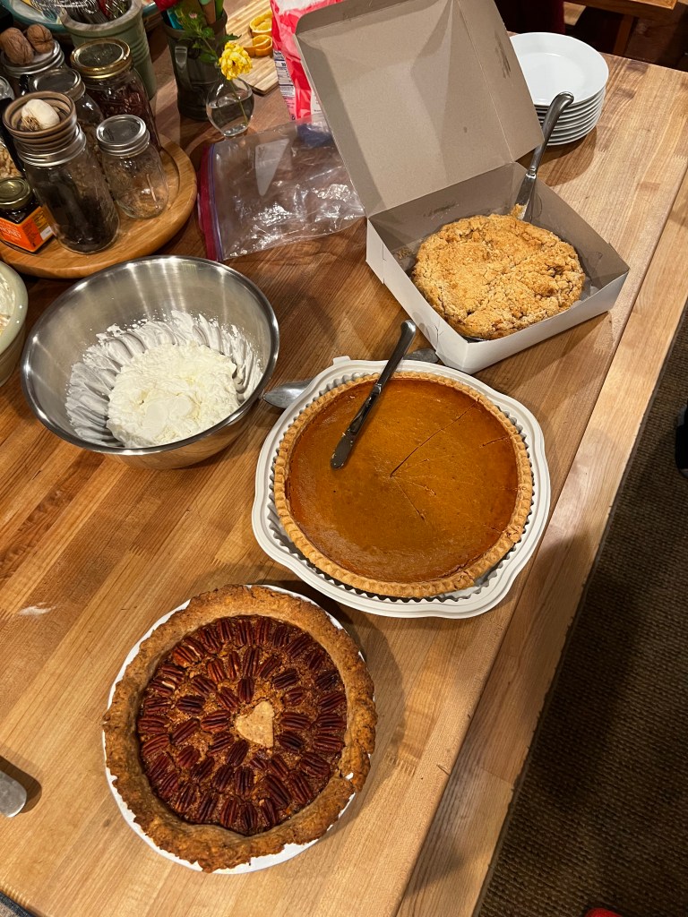 Then came dessert… Jim’s whipped cream, my pecan pie and a giant pumpkin and dutch apple that Janet brought..