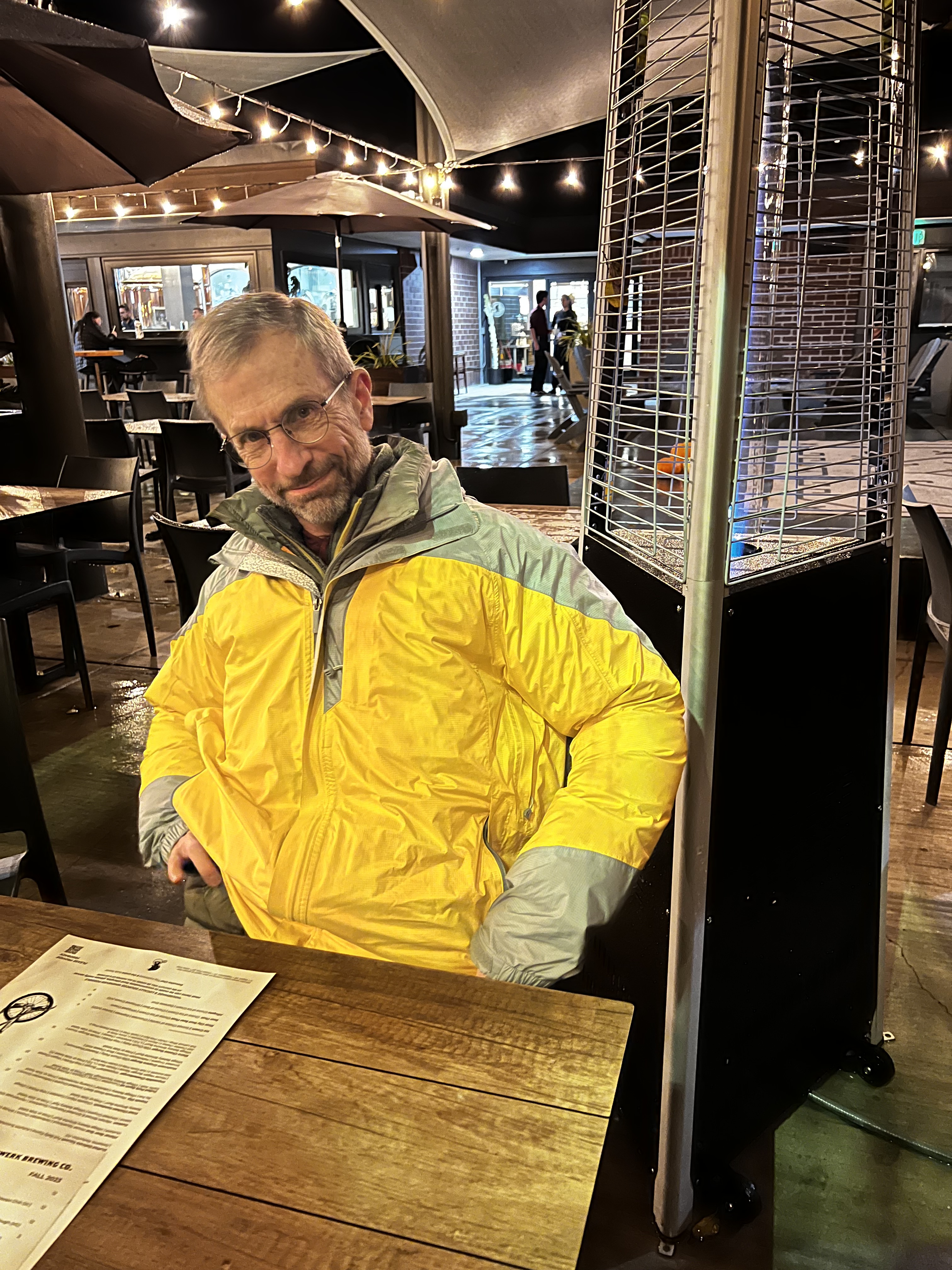 This guy acquiesced to sitting outside tonight at Sudwerk as we pub quizzed our way to 4th-to-last place. It wasn’t our best showing (in fact, it may have been our all-time worst!), but, sitting outside, we could actually hear the questions. I’ve been complaining mightily for weeks that the acoustics inside the restaurant were so horrible that I couldn’t hear and all but begged Jim to endure the cold — something he hates — to see if we could hear better outside. Which.. we definitely could. The sound was perfect. Though… in spite of many layers, a table right next to an outdoor heater, and frequent refills of hot tea, it wasn’t all that warm. And it was only in the 50s. Imagine later in the winter when nighttime temps drop into the 40s.