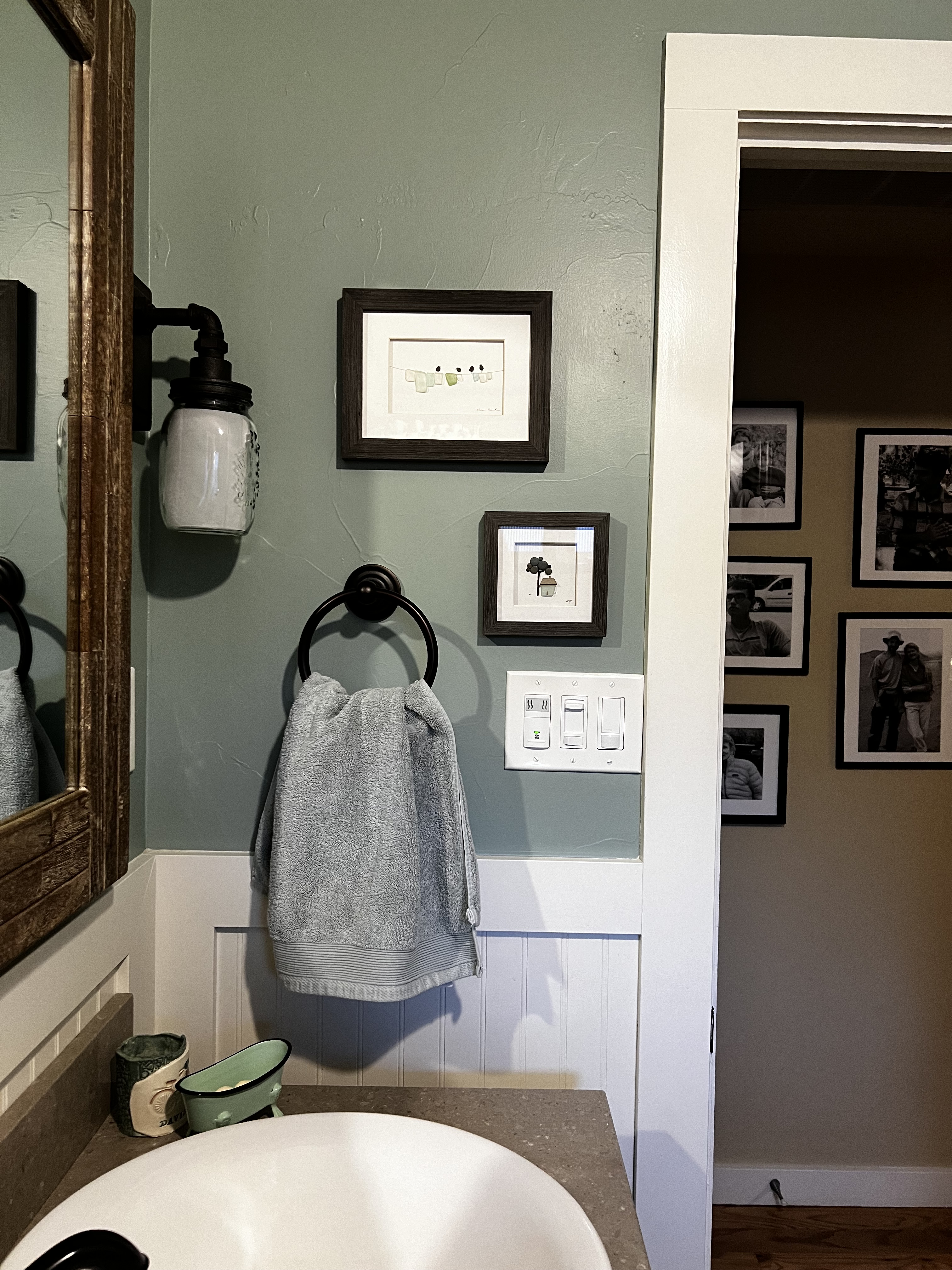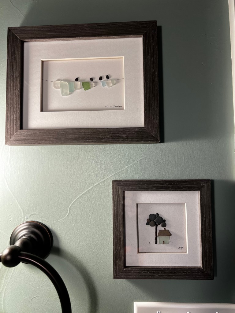 They are sea glass art pieces. I bought the one with the laundry line last year when visiting Lauren and Lucas in Mapleton. They took me to a gallery in the seaside town of Florence and I saw this sweet piece, loved it, and bought it. When Carrie and I drove through Florence a couple weeks ago, also on our way to see Lauren and Lucas, we returned to that gallery and I bought another one… the house under the tree. Almost too cute for me.. but it goes with the other one (which is the perfect level of cuteness for me).