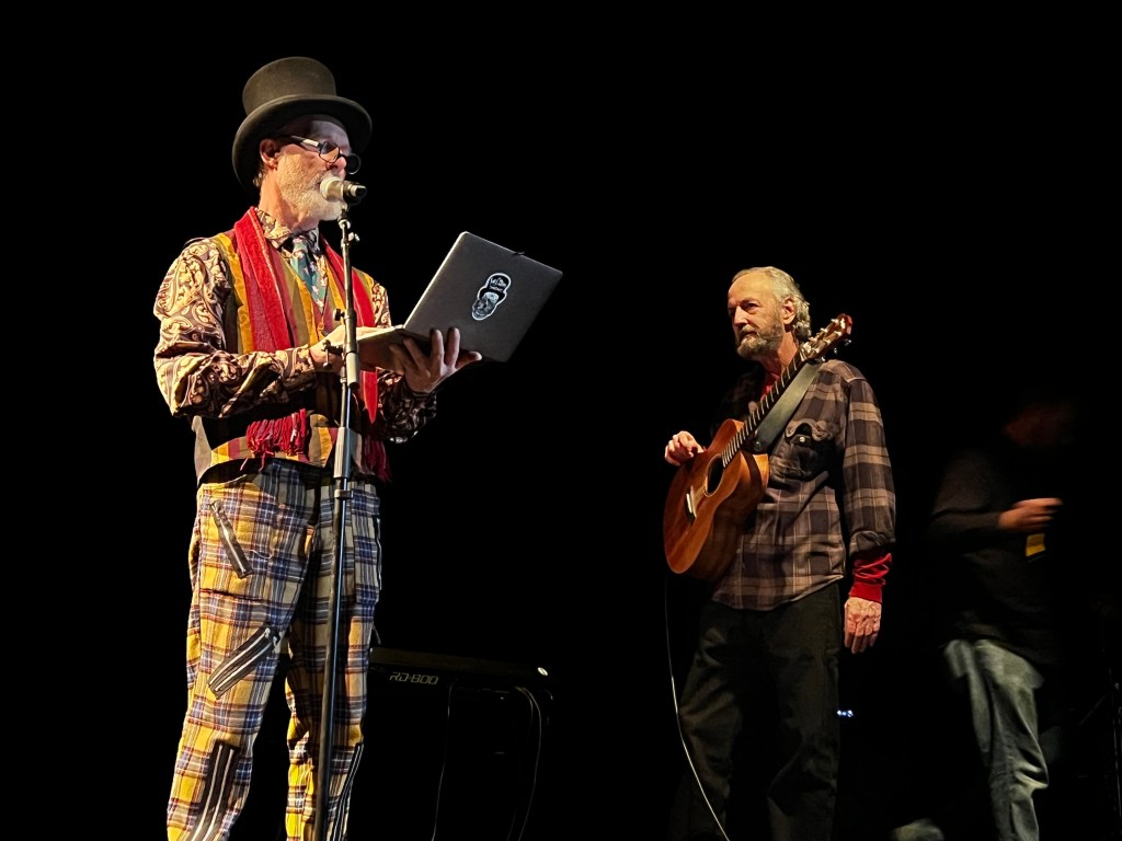 That title’s the sort of call and response that Joe opens the annual holiday show with.. as he jingles his bells and descends the theater stairs on his way to the Vet’s Memorial stage.