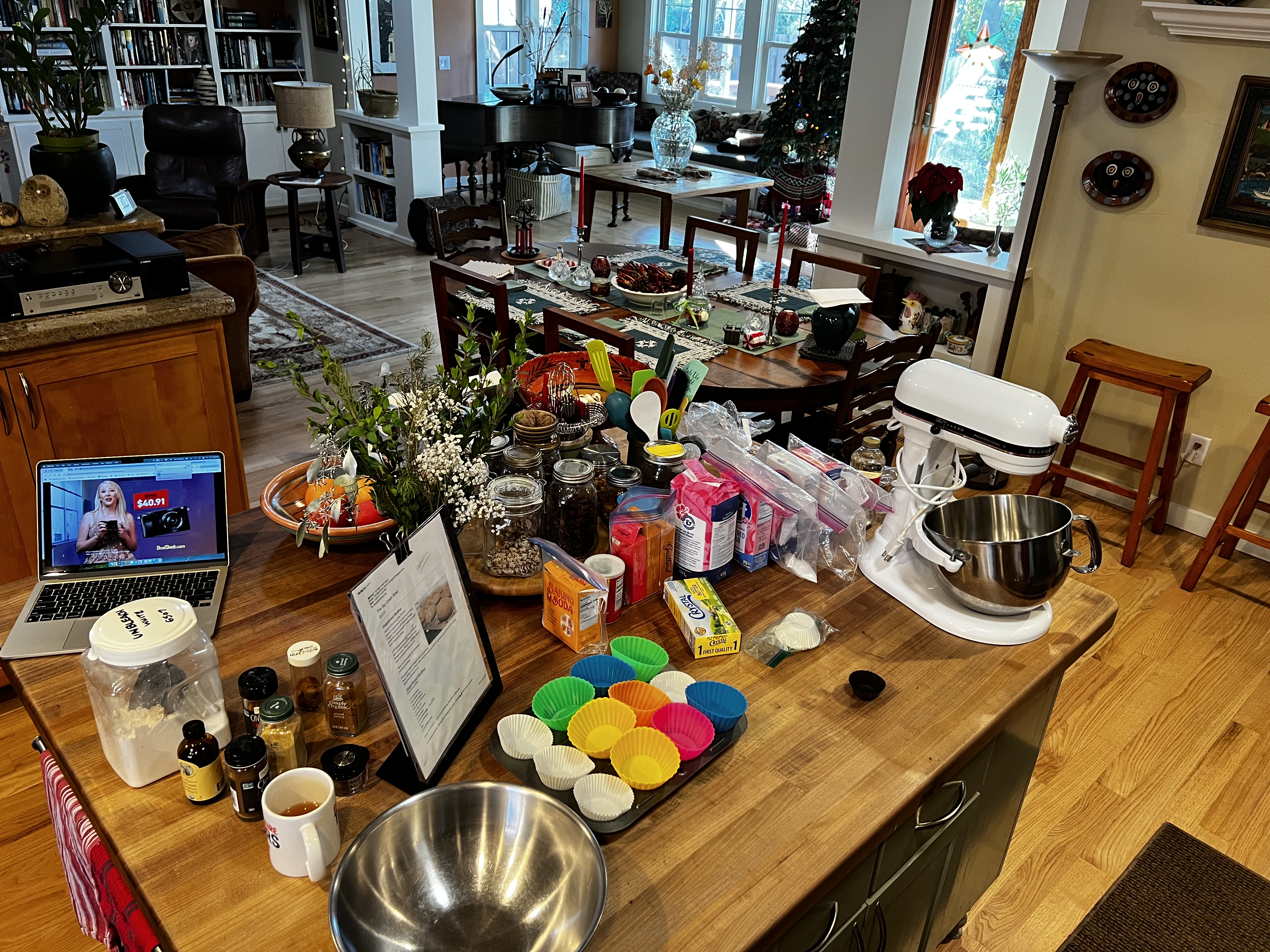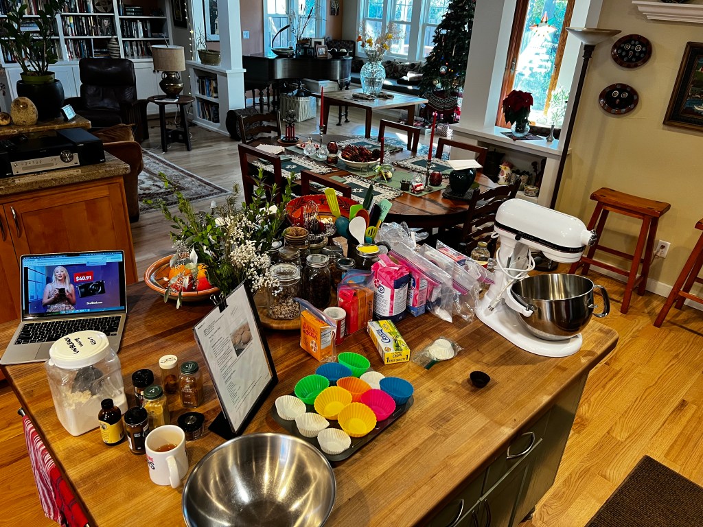 This is what I did this afternoon: made a batch of gingerbread muffins (had some issues, but since I’m the only one who likes them, that’s okay.. they’re quite edible). Then I made the dough for these amazing flourless chocolate cookies (made with ground almonds). Then I made the dough for my favorite Christmas cookies — Russian Tea Cakes (aka Mexican Wedding Cookies or Butterballs or Pecan Sandies). Then I made the pie crust for a pecan pie. Then I made the dough for a batch of cheese crackers. And now, all I have to do is shape and bake tomorrow.. and make a pie. And some other things.