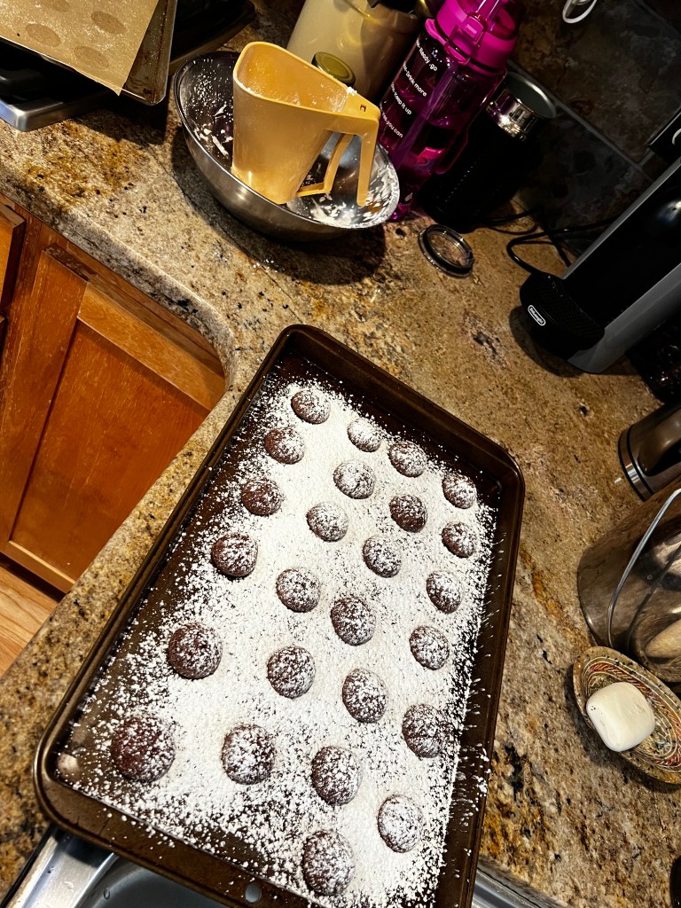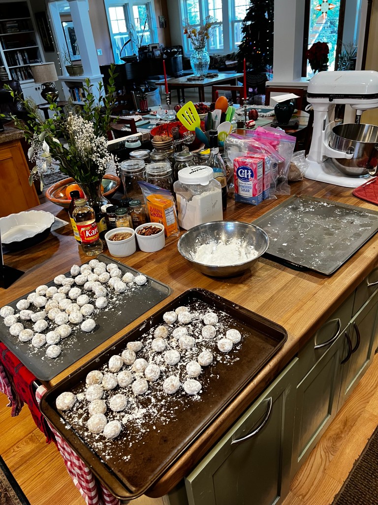 It’s 9:30 on this Saturday night… Jim and I have another three hours before we go to the airport to fetch Peter and Maya. I’m all atwitter. Finished a boat load of baking — 17 dozen cookies and a pie. Glad I’d made all the doughs yesterday. Shopped a bunch, reorganized the fridge a bit… things like that. Now doing puzzles. All ready for tomorrow’s Christmas Eve dinner.. mostly.. just need to assemble in the croc pot (making a roast w/ potatoes and carrots, which will slow cook all day). Easy and tasty.
