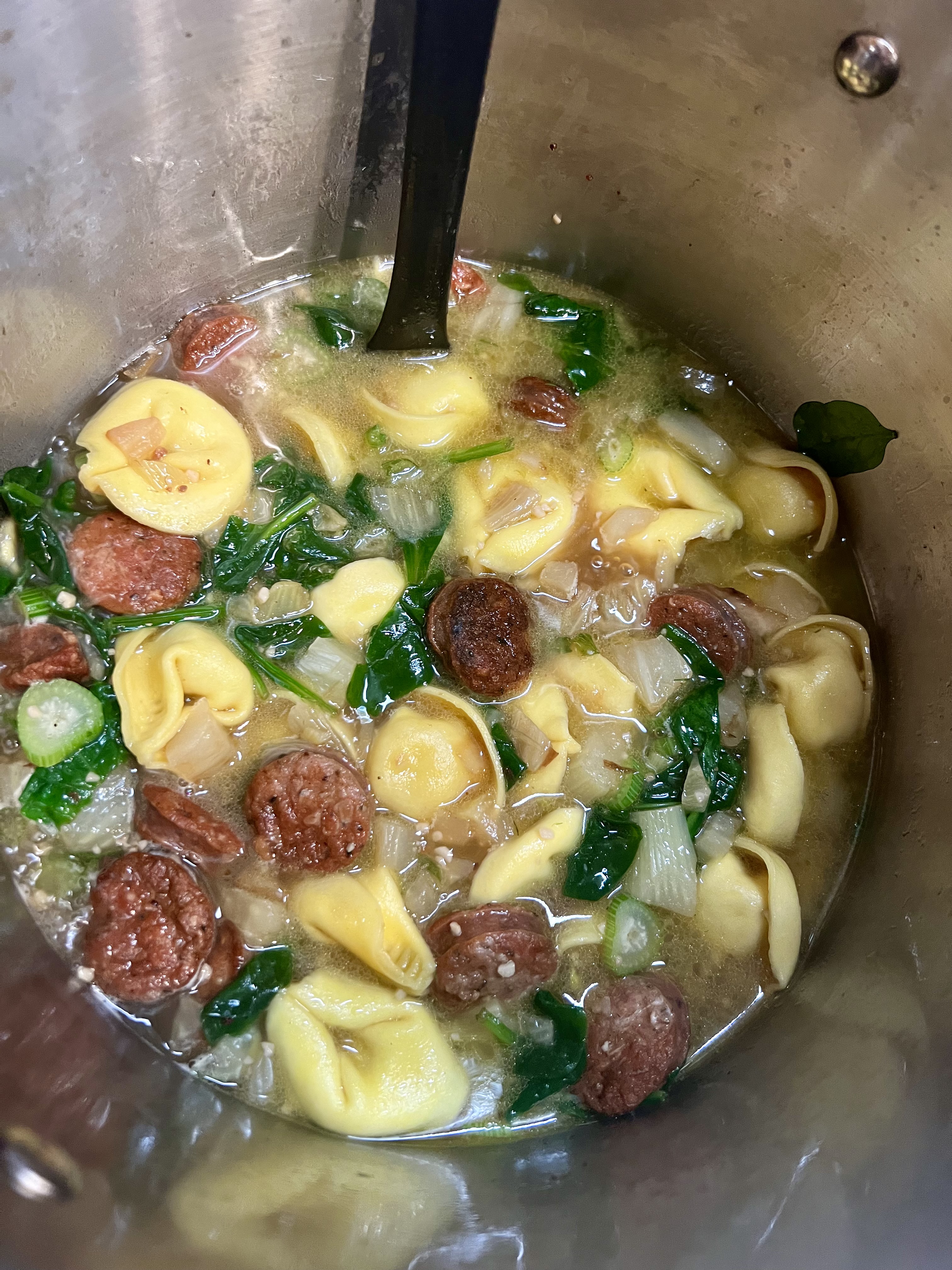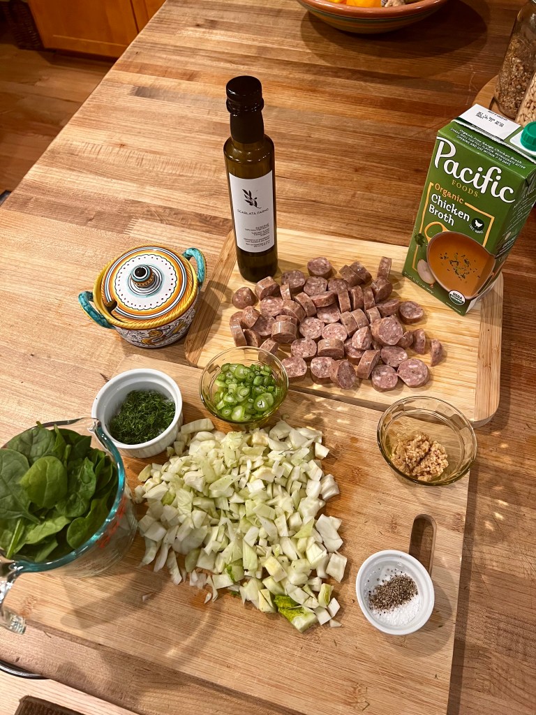 Coarsely chopped the bulb, thinly sliced the stalks and finely chopped the fronds. Then gathered the other ingredients: andouille sausage, olive oil, chic broth, garlic, s/p, spinach. Tortellini will be added toward the end and parmesan will be sprinkled atop.