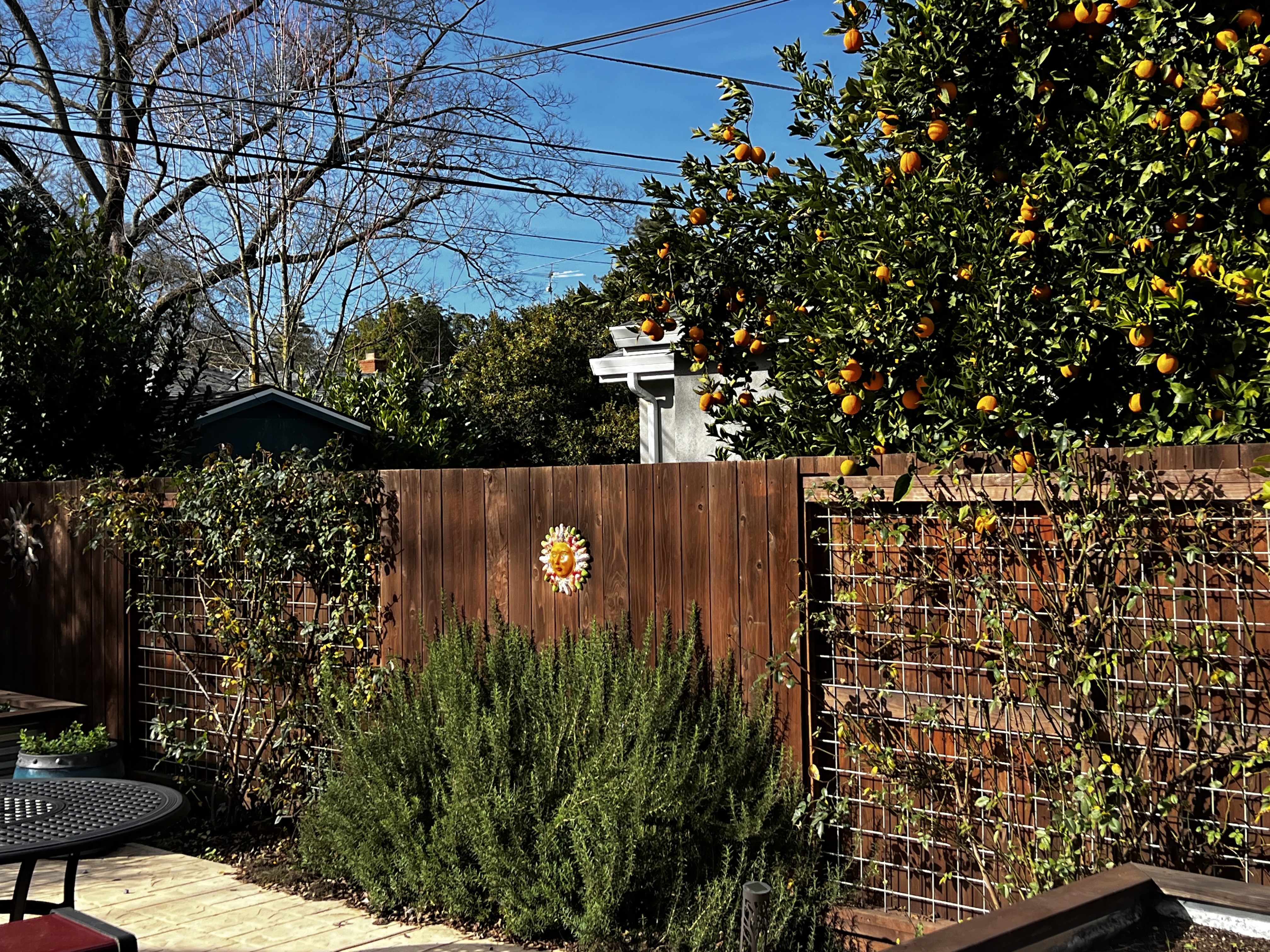 The neighbor’s citrus trees are dense with fruit and the climbing rose vines are thinking about setting some buds. That rosemary’s super thriving:
