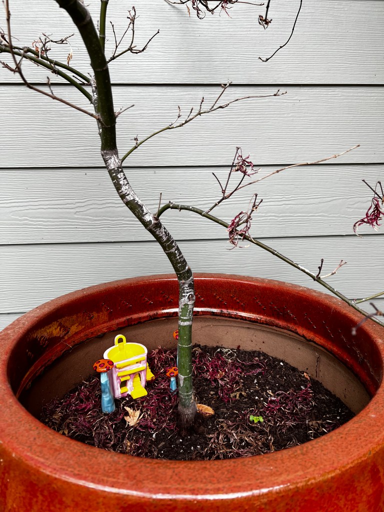 And then Chris gave us something quite unexpected… a fairy house and some mushrooms (his words). I asked him what one does with them and he said to put them in a favorite potted plant or garden box.. so I put them in the Japanese maple on our front porch (currently leafless).