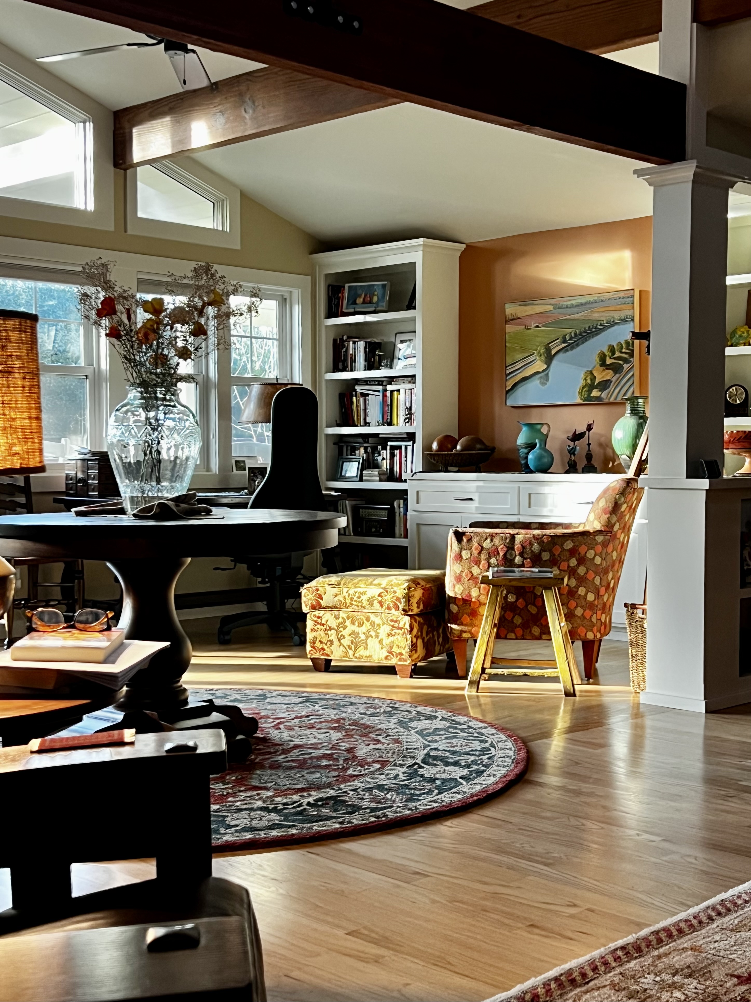 No matter. It’s over.. now just healing. But I’m still super spotty and scary looking… so still hiding out inside. I look longingly at the sunshine streaming through the windows.. wanting to be out and about. The view from my chair this late afternoon…. sun streams…