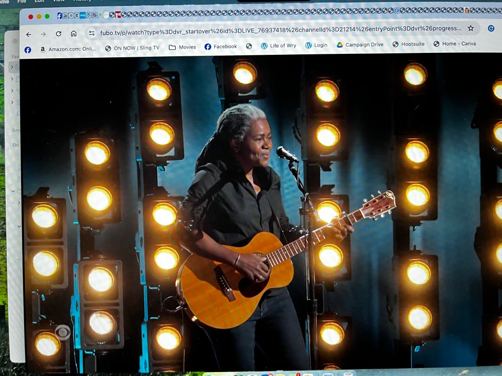 Cried at this: Tracy Chapman, who rarely performs in public anymore, singing Fast Car with a country music guy (whose name I forget, but he was lovely). She is such a class act. I just lost it, seeing her grey hair, hearing her voice, singing along (like the entire audience did), and gave her my own standing O.