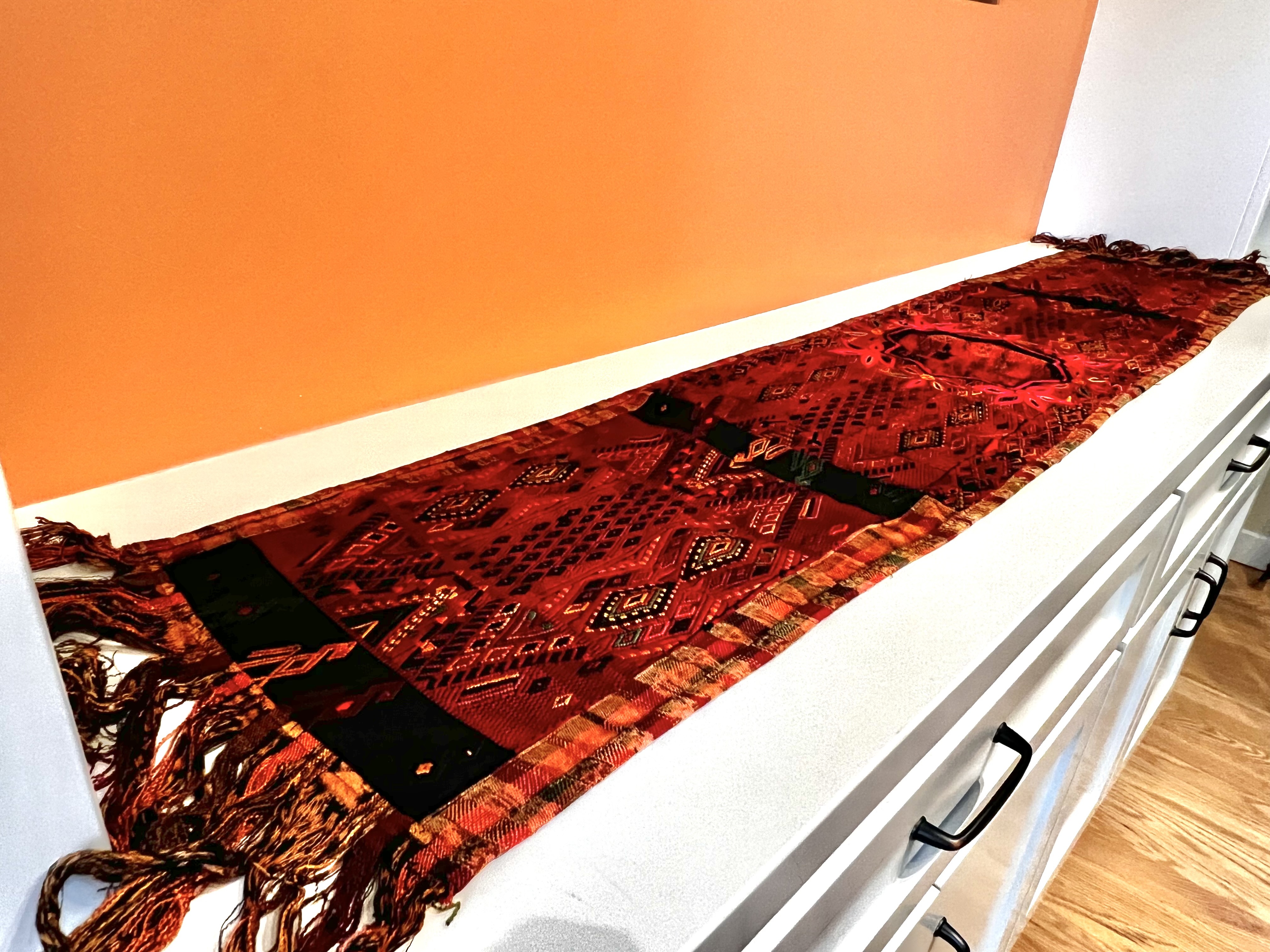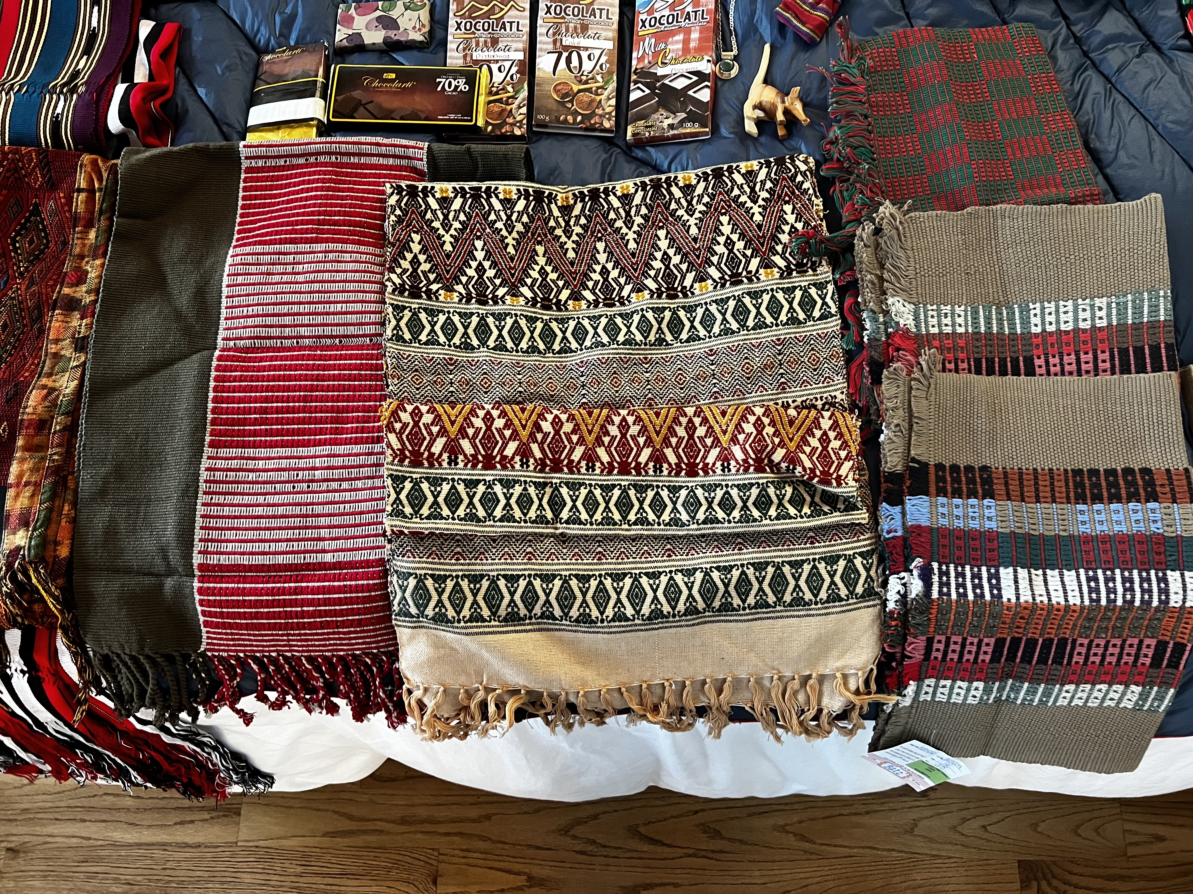 Tapestries and fabrics. There are table runners, placemats, dishtowels, coasters. Some of these were purchased from weavers whom we watched as they demonstrated their craft — either using a back loom or a standard loom. Some were purchased from sidewalk vendors, at least one from a woman who chased accompanied me down the street (I was ultimately glad to purchase from her). The 6″x8″ coasters were a gift from Lance.
