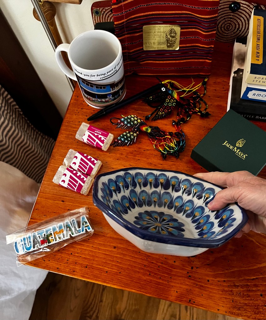 But wait… there’s more… a pottery bowl (from a studio where we learned about the process of shaping and glazing these pieces), and a gorgeous jade necklace (the photo does not do it justice). Jadeite jade is sourced in Guatemala. “The first civilization to use jadeite jade were the Olmecs, Maya and Aztecs, and jade figured prominently in many myths and folktales.” More on that later. We learned all about jade/jadeite at the jade museum in Antigua. Most of us went home with at least some jade. Also in the photo on the right.. two beaded birds (I believe they’re supposed to be Quetzals) purchased from Magdelena (who I’ll talk about later), a mug that was given to each of us from one of the schools we visited, a goofy Guatemalan refrigerator magnet (don’t ask what possessed me) and some hotel soap (again.. ).