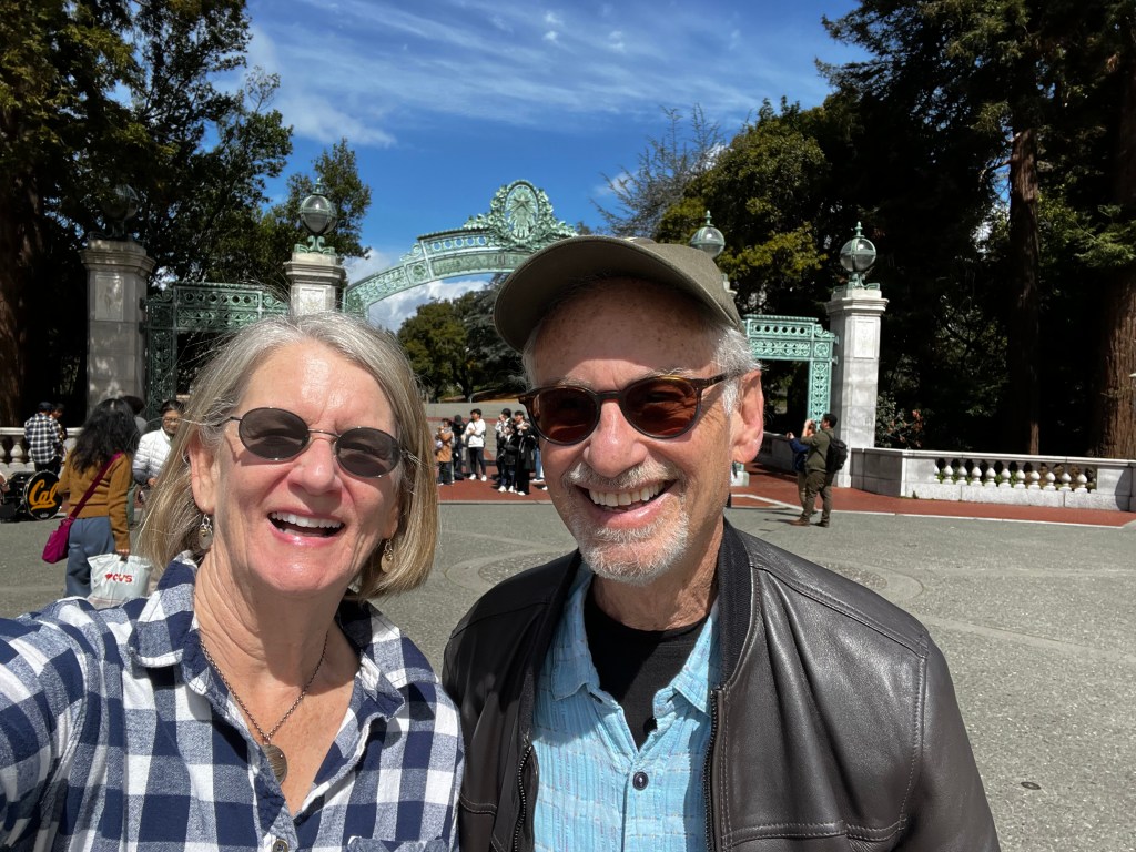 The birthday celebrants, with Sather Gate in the background, and the Cal band to boot (a fraction thereof)! Nice of them to come out and serenade the crowd.