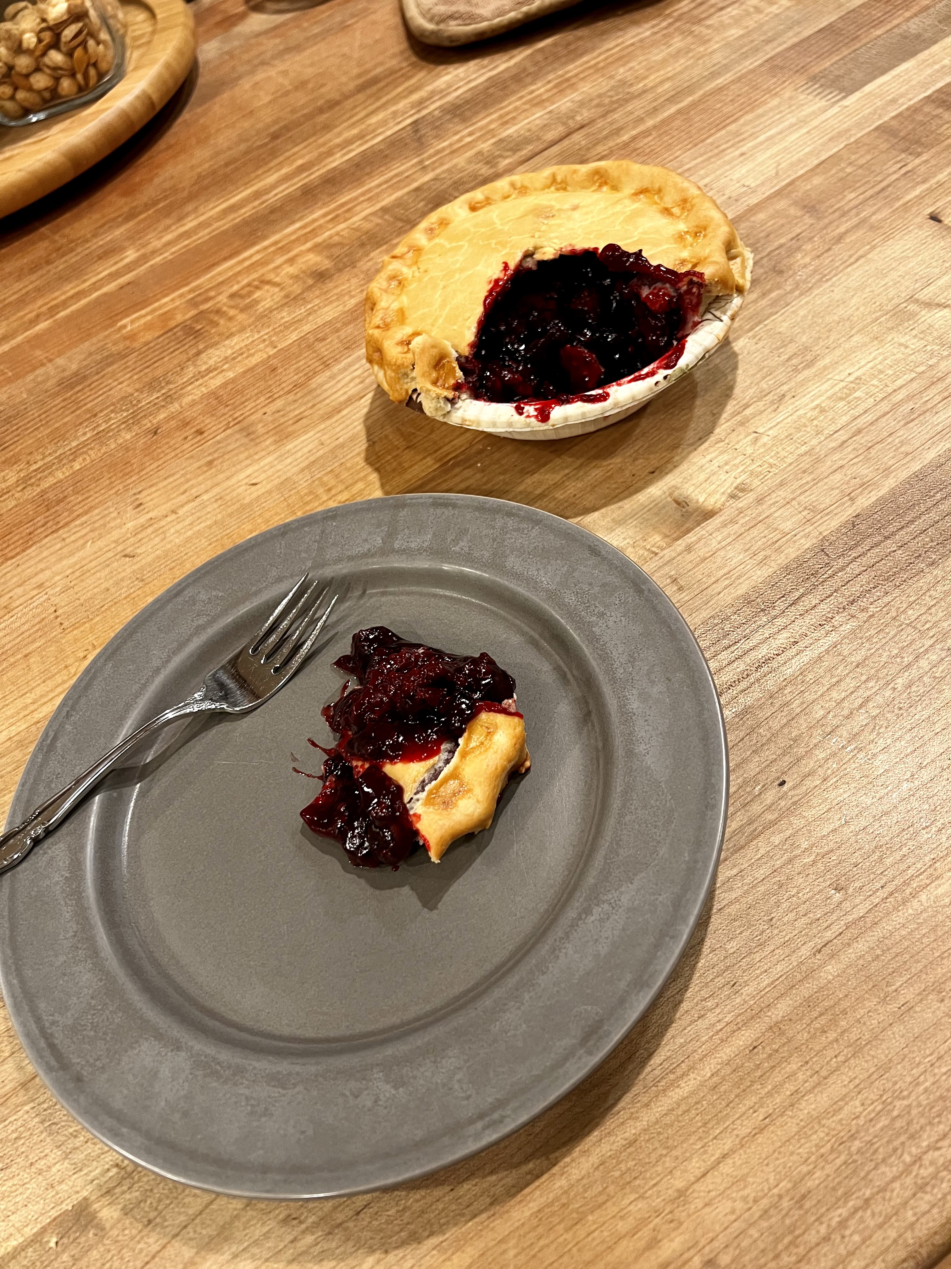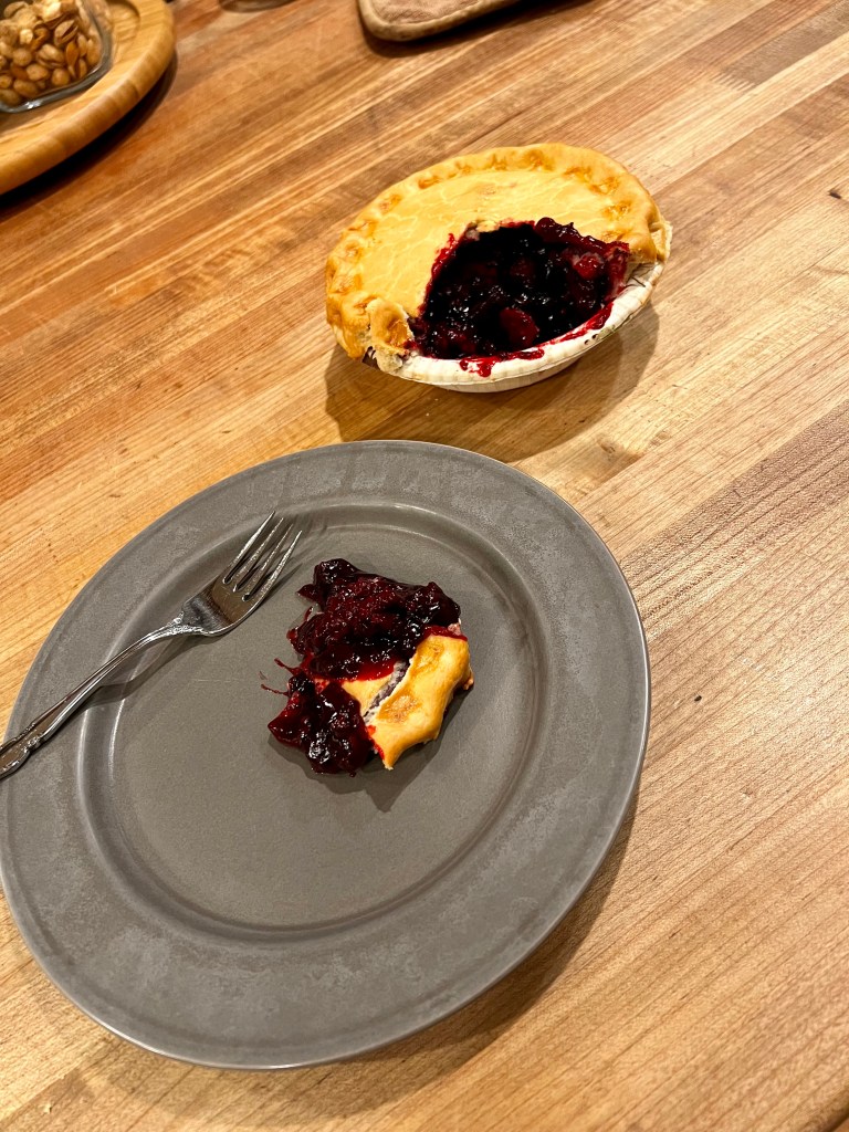 Peter’s not around to make Pi Day feel like a real holiday, but in his honor, we ate pie for dinner… Chicken Pot for the main course (no pic) and Marionberry for dessert — both courtesy of Ikedas, both pretty darn good! Not much of a shot, but there it is.