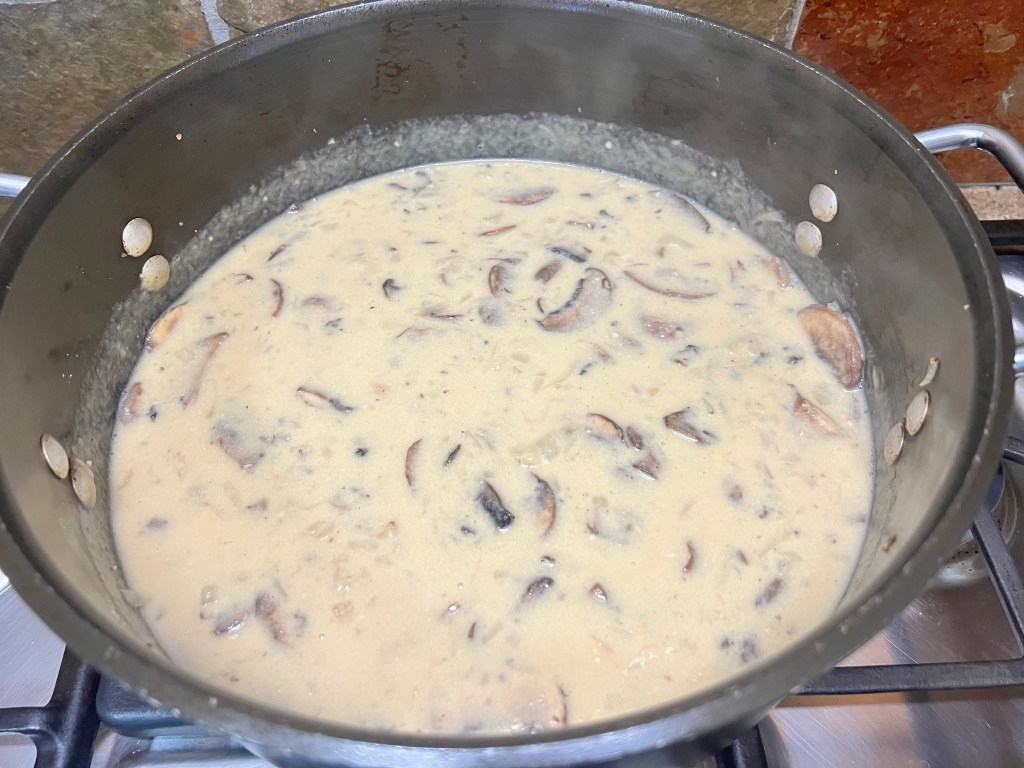 And finally a mushroom soup that you make (rather than use canned cream of mush soup.. a staple of so many casseroles!), that’s got butter, onion, garlic, crimini mushrooms, flour, broth, milk, dijon, cheddar, s&p (which was quite tasty!):