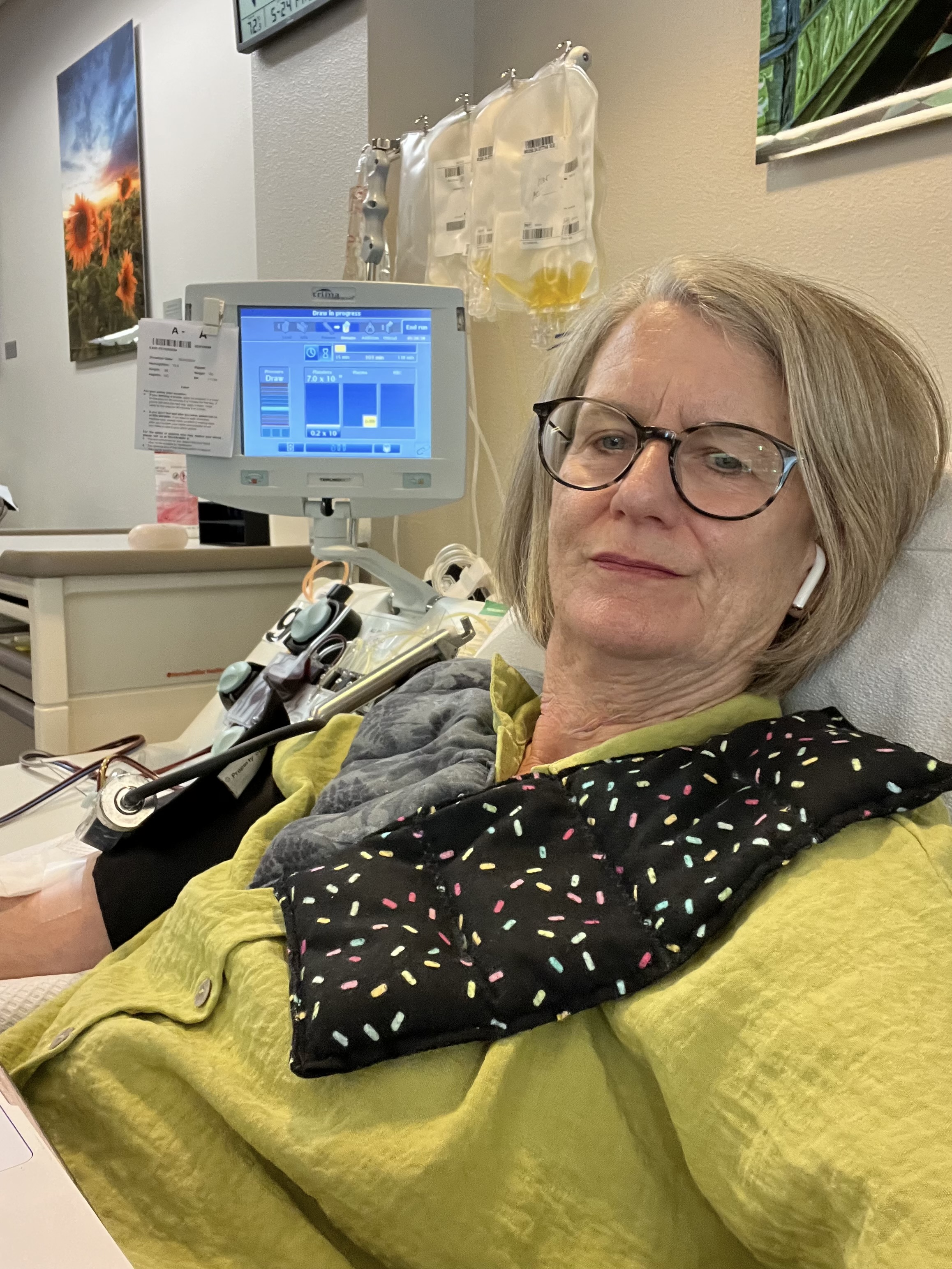 That black thing is not a fashion accessory.. it’s a heated rice bag. The staff comes around and changes them every half hour or so. Off camera, I’m also fiddling with a heated rice bag in my right hand, per instruction. Keeps blood moving, I guess. My right arm has to stay put for the entire session, as it’s hooked up to machines via a needle in my arm and a tube that flows to and from it. I can’t tell you exactly what’s going on here, because I don’t look, but it has something to do with extracting blood, separating out the platelets and returning the blood. I keep my blood, they keep my platelets. This is different than giving blood, where you leave the place a pint down. The advantage of giving platelets is that you feel completely fine afterwards because you have everything you came with… the thing you loose is time (and a little bag of yellow stuff they use for cancer patients, mostly. If I continue to give platelets, I’ll make an effort to understand exactly what I’m doing.