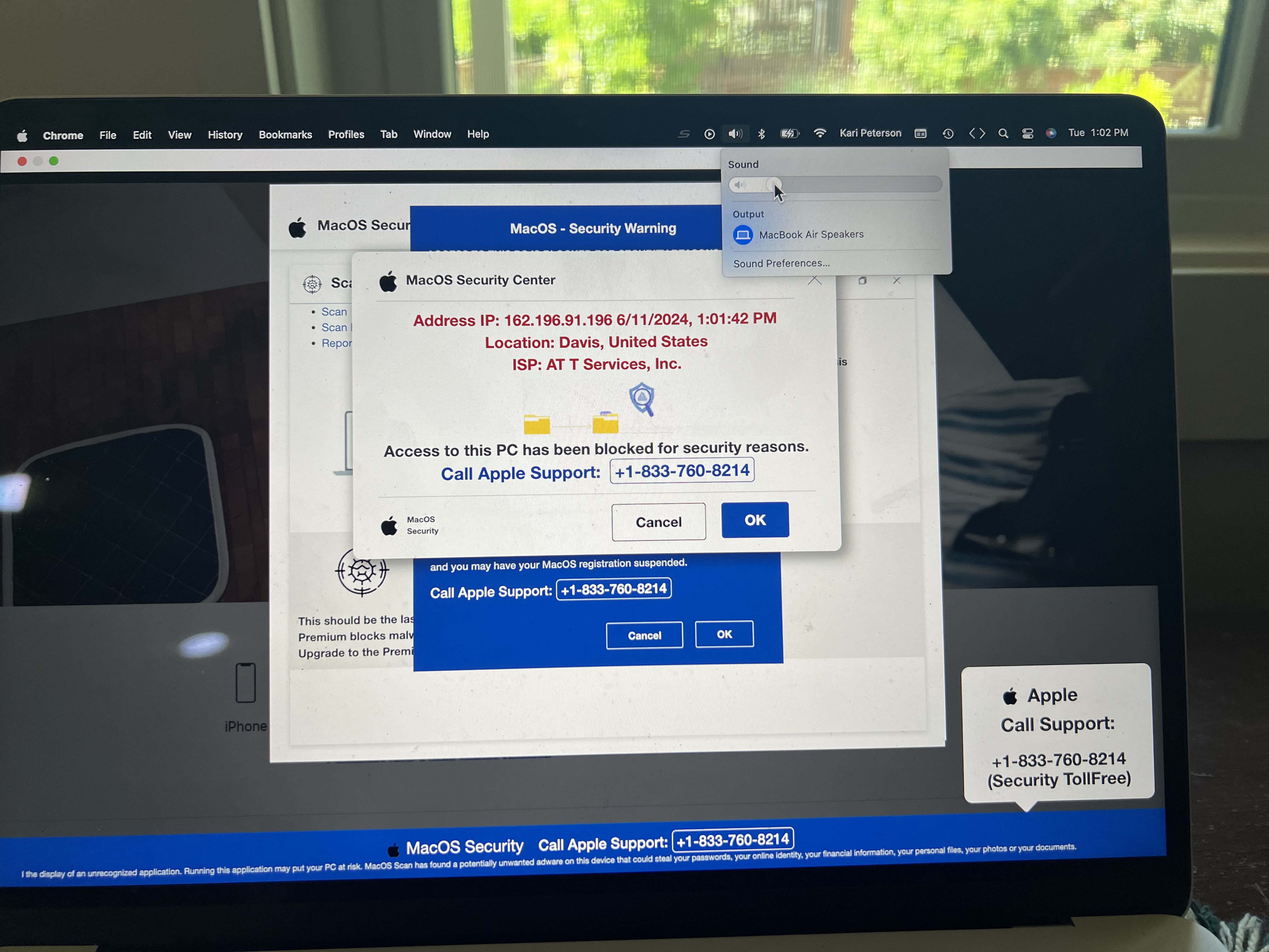 I remained pretty panicked and resumed my fiddling with the windows. I still couldn’t close them but regained control of my cursor and was able close down my computer. Then I blocked that “Apple Support” number. Using my phone, I did some research and found that it was, in fact, a scam. Most sites said that if I didn’t give up any info, or share my screen, I was okay. I gave it about 20 minutes and when I rebooted my laptop, it was still there. This time I was a bit more composed (though still in a state of mild panic, seeing the windows still there). All I had to do was close that tab and voila, scary windows gone.