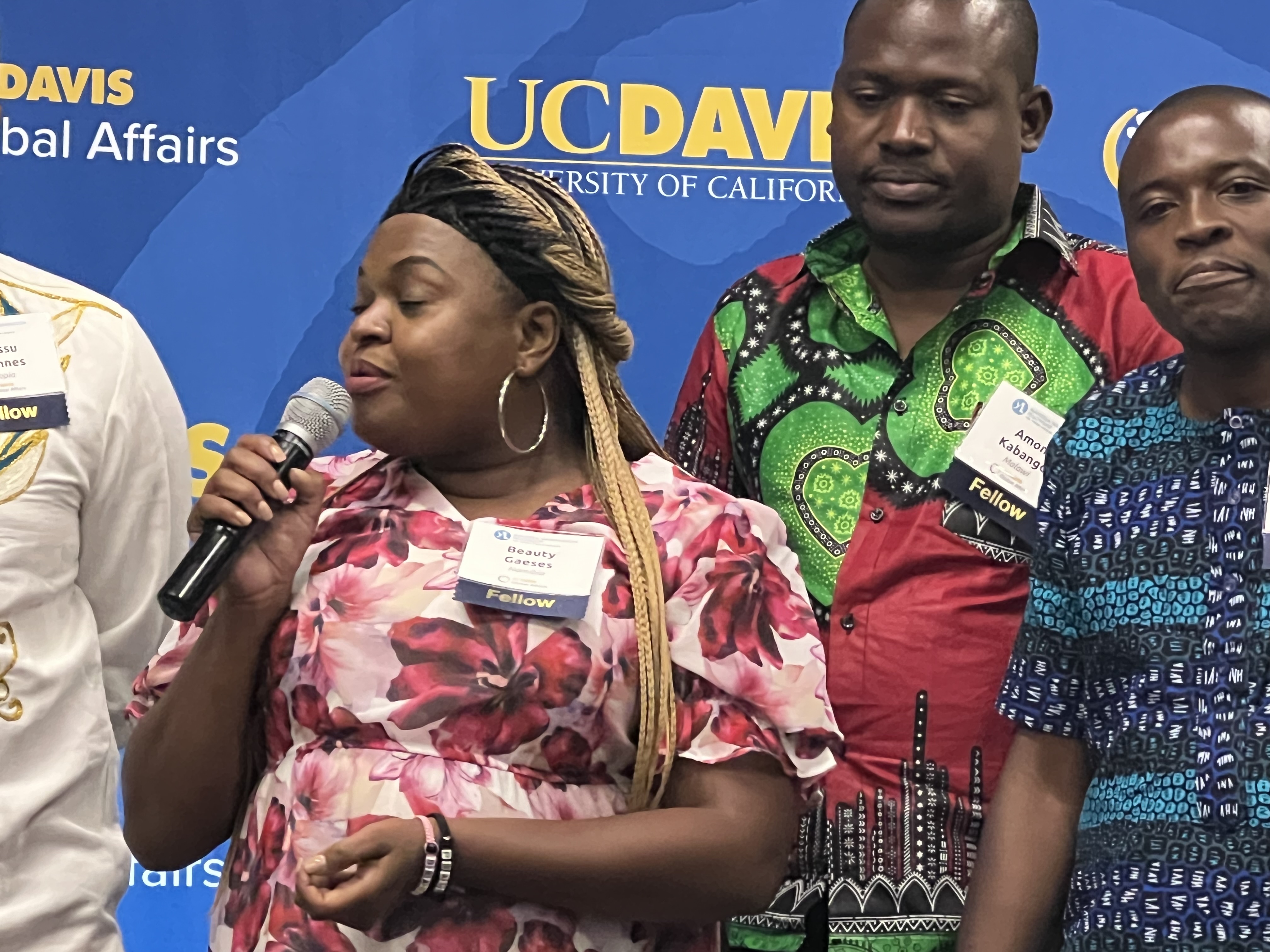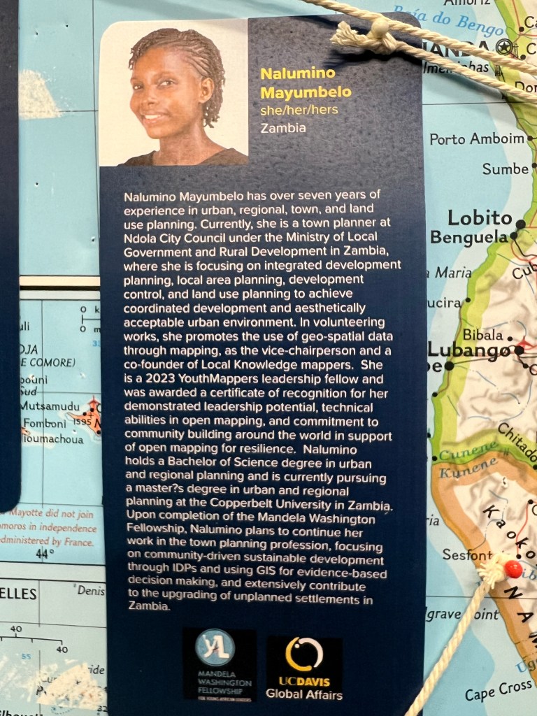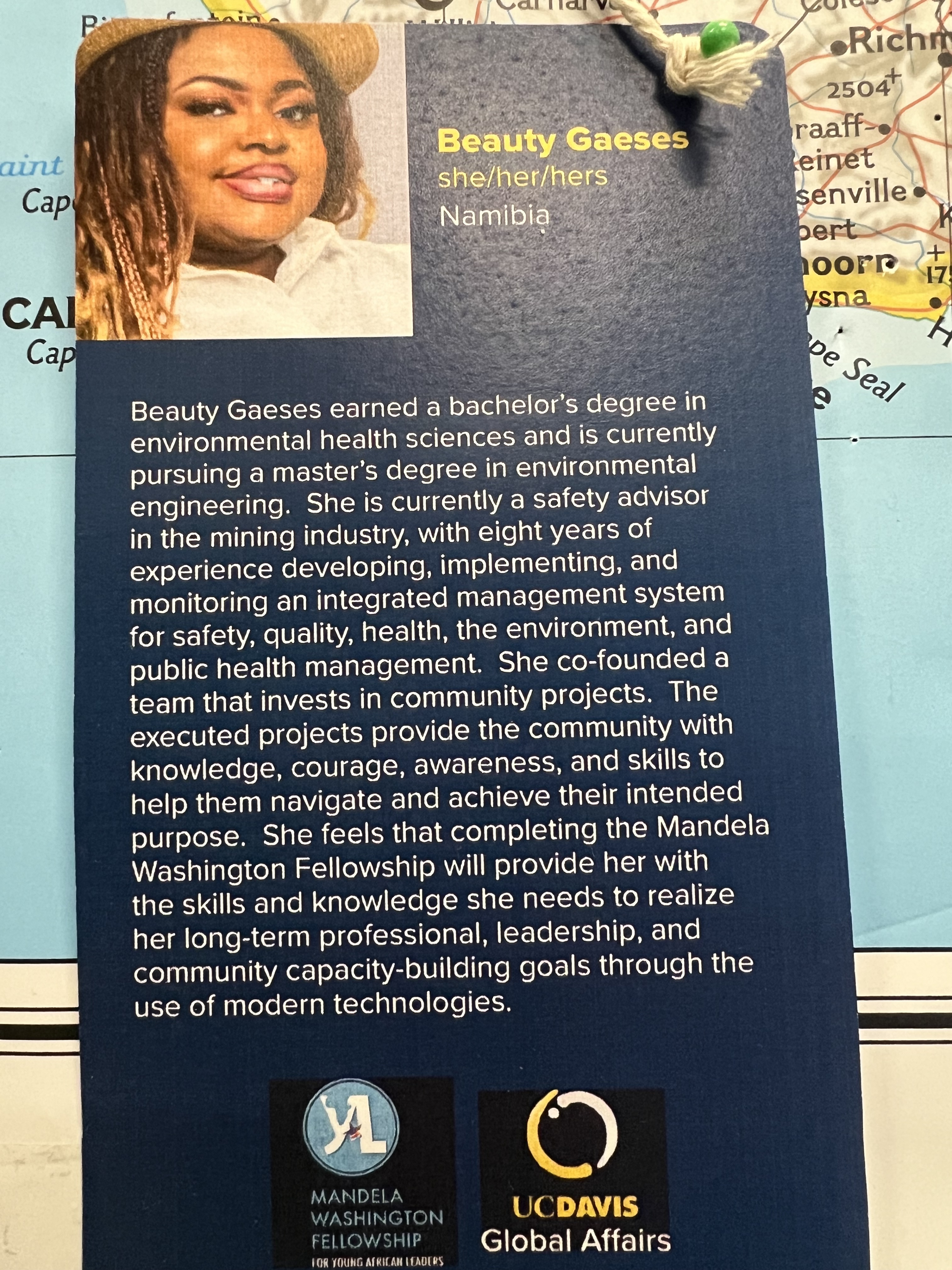 So, Tuesday. We had our two fellows over for dinner. We learned about life in Zambia and Namibia, we learned about their jobs, we learned about the projects they are initiating as part of this fellowship. All impressive. I’m including photos from the evening, as well as a pair of biographical cards posted on a giant map of Africa — part of a display at Friday night’s Mandela Washington Fellowship reception — that provide a nice overview of Nalumino and Beauty.