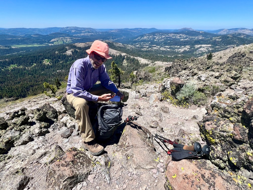 This is Jim trying to figure out which is the actual peak (#3): To the right of his head is the long ridge we hiked to get to the ridge we’re on now.