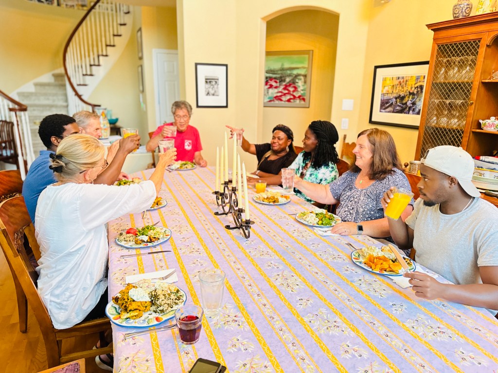 Jim and I cohosted a Mandela Fellows dinner tonight with Margie and Wes, combining our fellows, and even adding one to the social mix! We met at M&W’s house (good choice!), and each of us hosts contributed dishes. Excellent dinner, interesting conversation and a long and leisurely evening on a warm summer Monday!