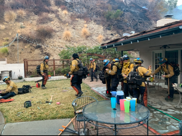 These were from last week. The John Frames evacuated their home, way up the hill in Arcadia, pretty much on the wilderness boundary line. Arcadia is a bit east of the Eaton fire that destroyed Altadena. The fire crews used their back yard as a gathering spot, or staging area of sorts, or so it looks from these pictures. The crews had thrown all flammables into the pool, had beaten back the flames — which came within 20 feet of John and Maita’s property — and here are enjoying some cold drinks before returning to work. I think that’s about the story.