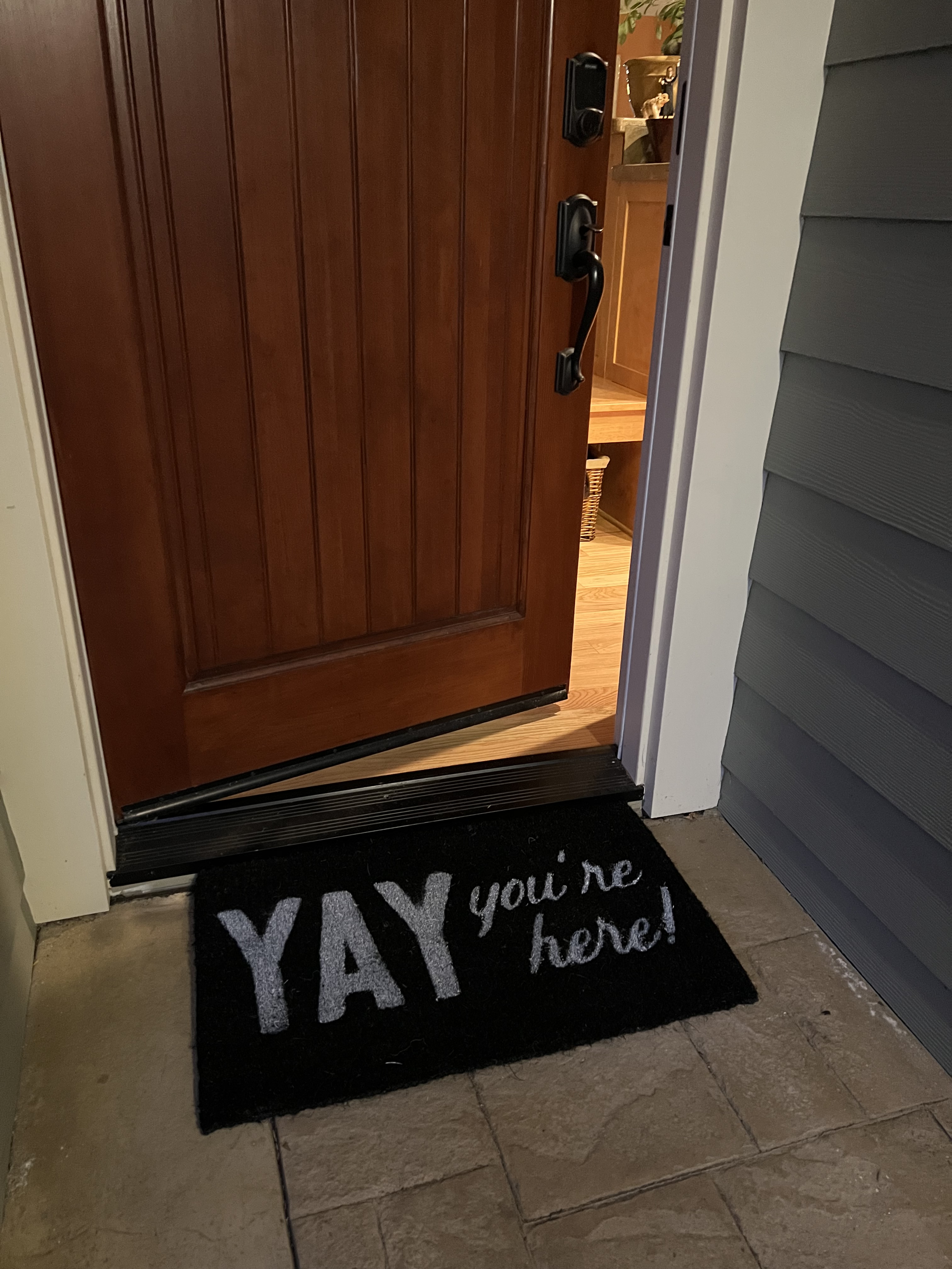 Lisa and Claire have a welcome mat at their home in Ann Arbor that I comment upon every time I see it. We were at the Davis Food Coop picking up some stuff a couple days ago and Claire noticed this mat on display in front of the store. So… she bought it for us!