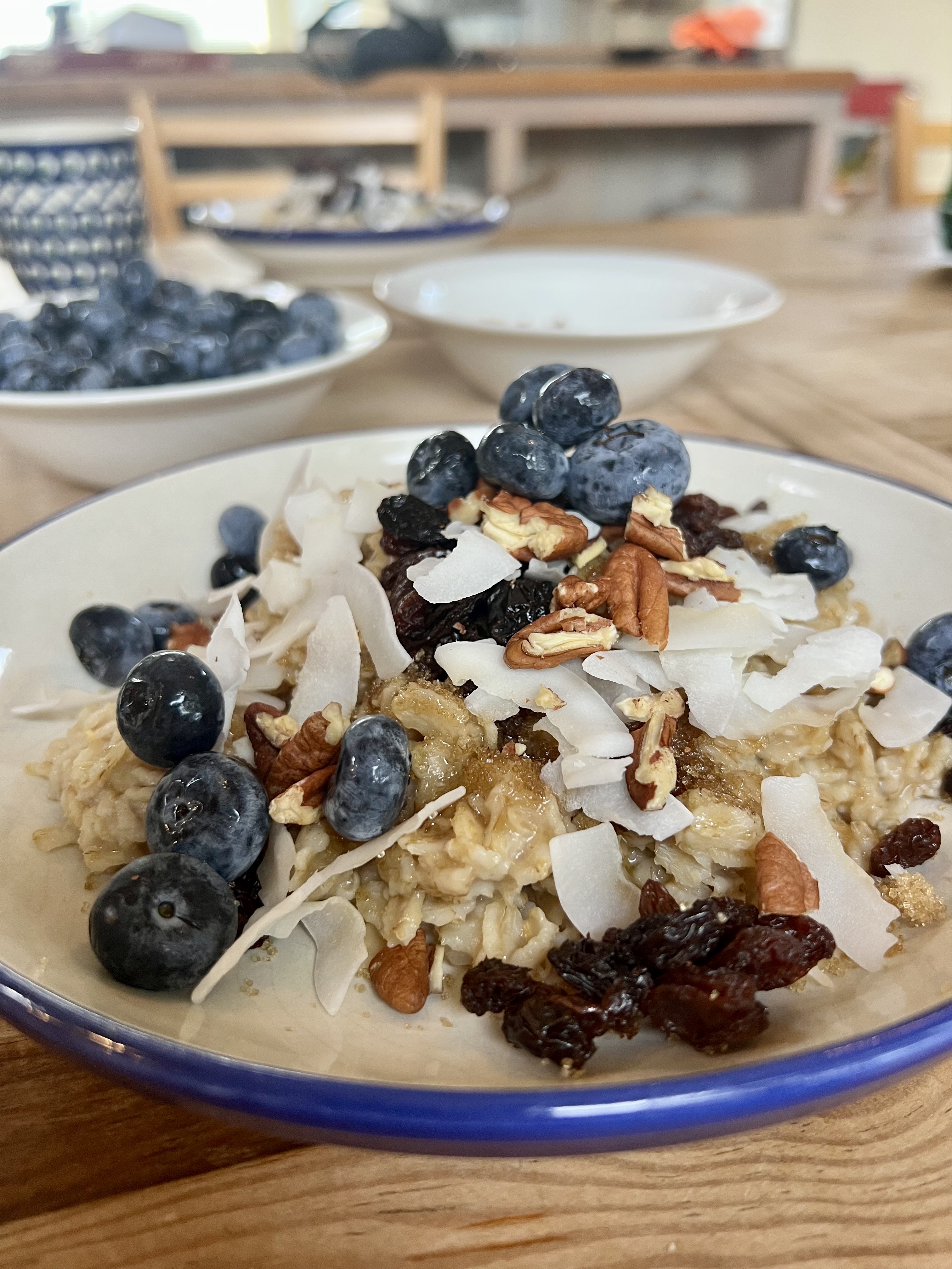 The day starts with what has become our traditional Dillon breakfast: oatmeal, blueberries, raisins, coconut, pecans, brown sugar…