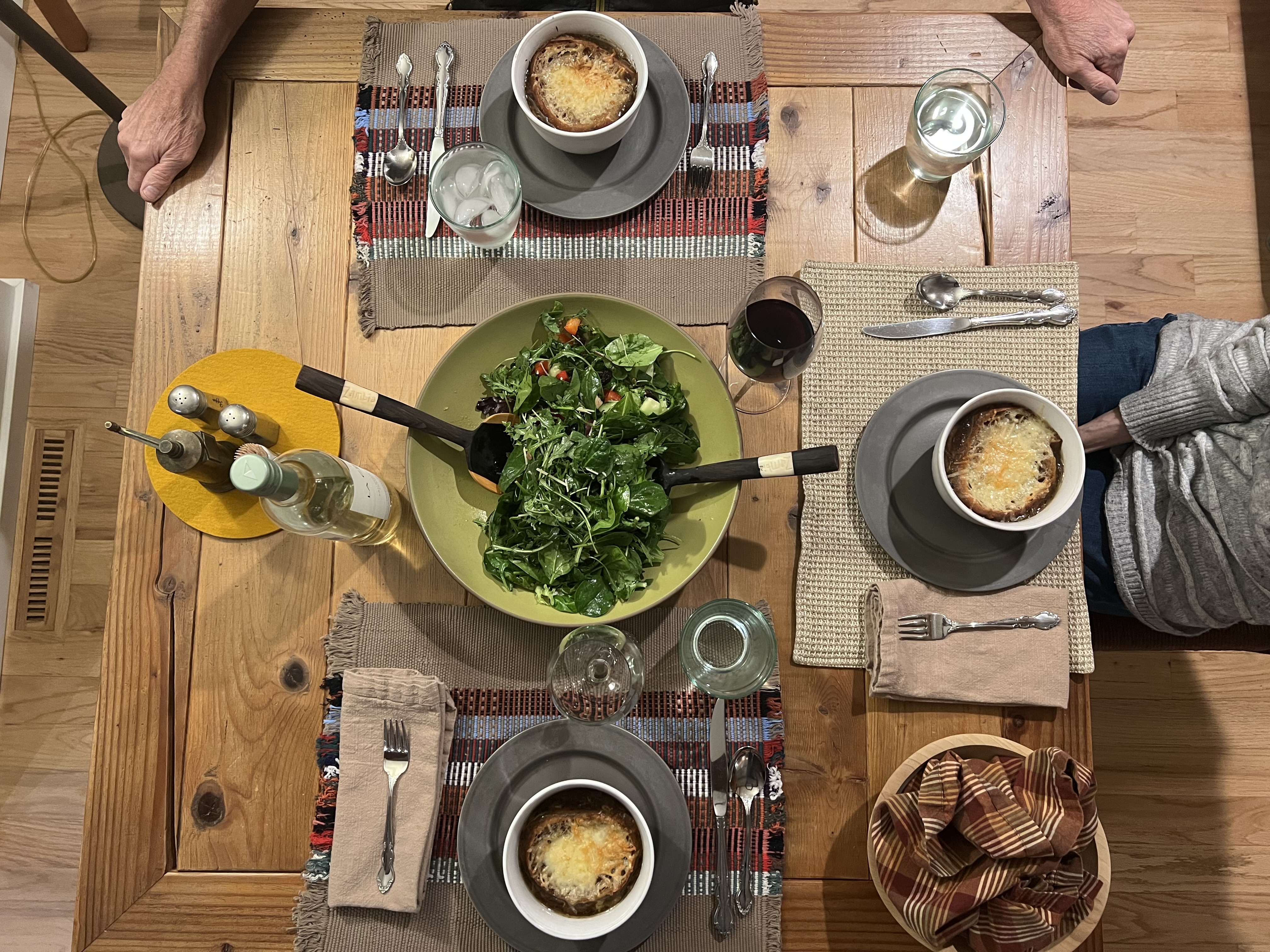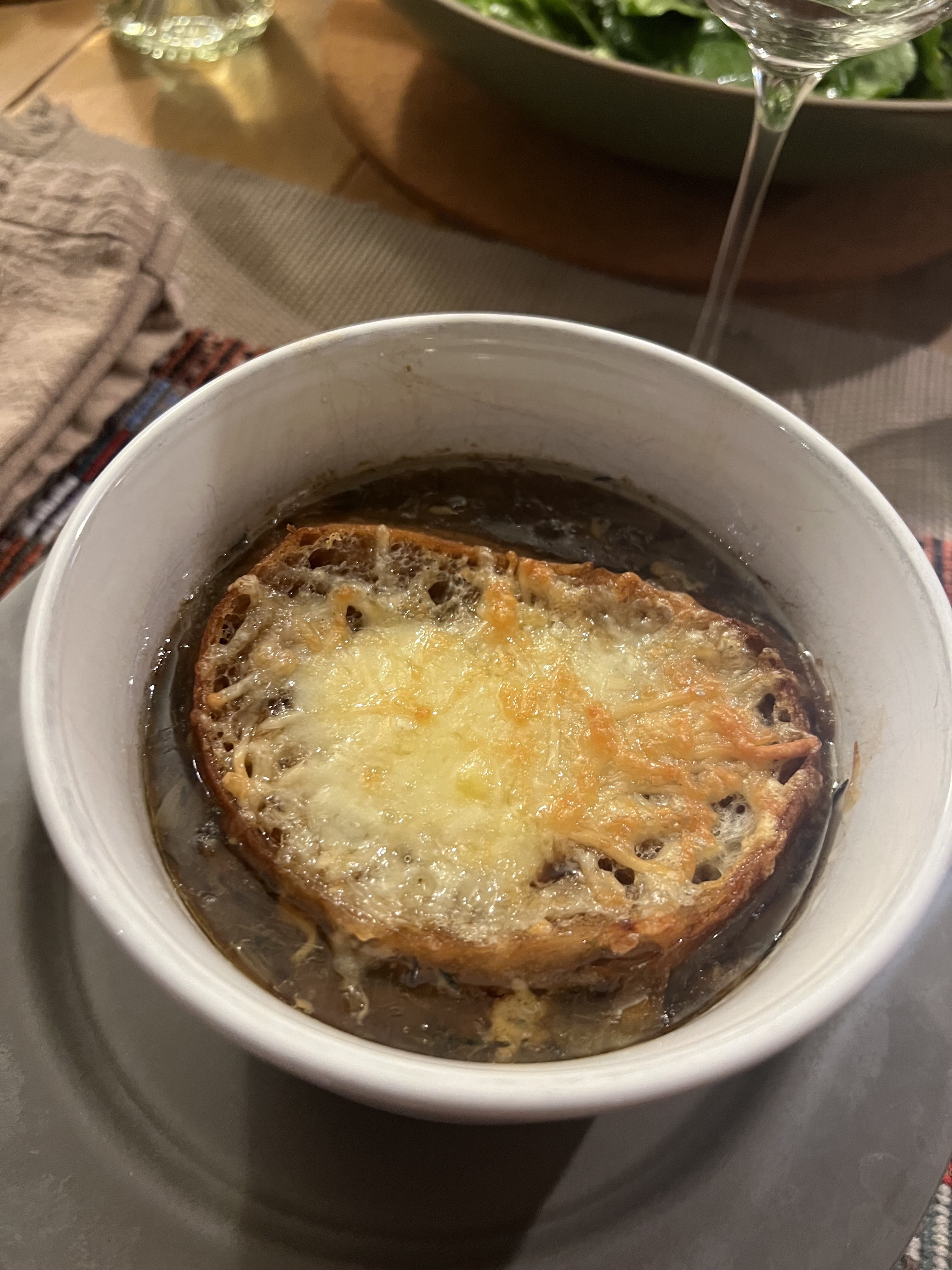 Took about an hour to carmelize 3 large white onions, but after that, the rest was easy. The hour gave me time to prep the rest of the dinner.