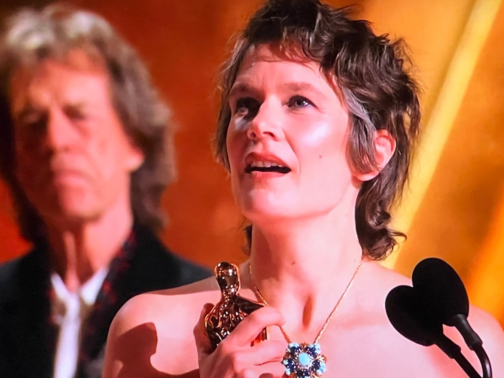 One of my favorite parts of the evening was when Mick Jagger came out to present the Oscar for best song. Don’t really remember the song (it was from Emilia Perez), but it was a gas to see him appear on stage. This isn’t much of a pic, but it’s the best I could snap as I was treadmilling along. He was really funny.