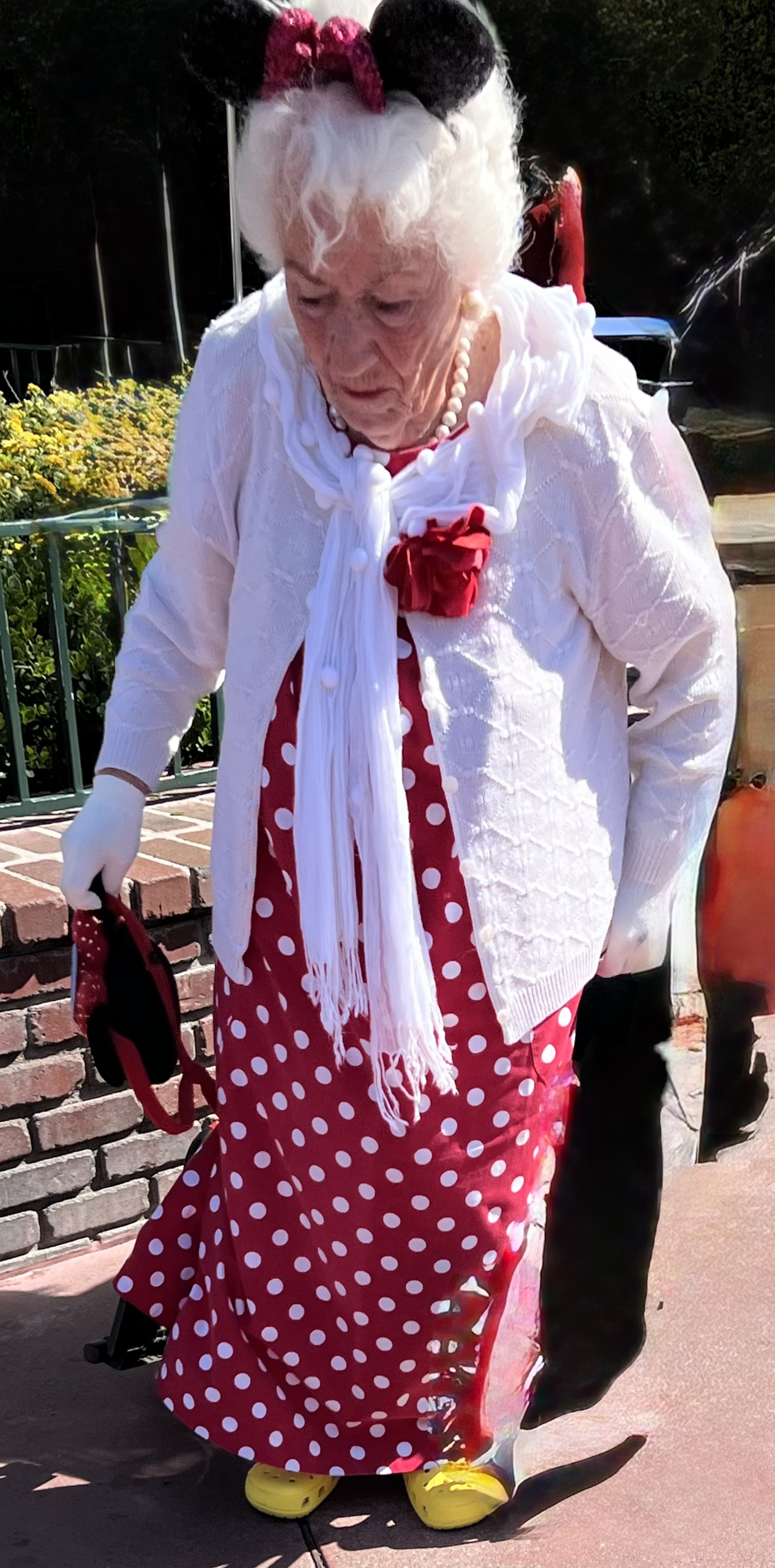 As seen at the park entrance… this very lovely woman dressed just like Minnie Mouse. And, new to me, all the mouse ears! A huge, huge percent of folks don mouse ears of all types, as well as princess costumes and Minnie Mouse outfits (it’s mostly women and girls who do these things). But this woman wins the prize for me… she was very elegant and dignified in her Minnie wear, right down to the white gloves and yellow crocs.