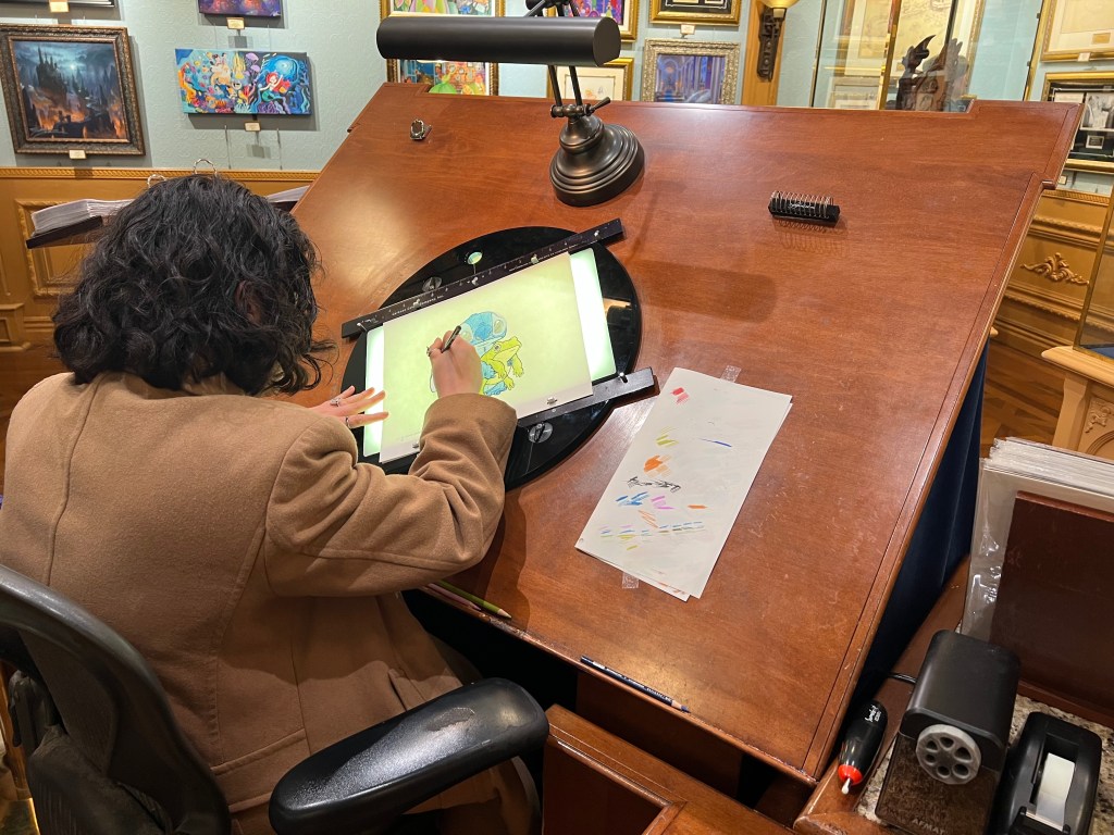 Finally, on the way out, we stopped in a gallery and looked at vintage art and drawings. That was worth it. Plus got to see this young (early 20s?) artist at work at an animator’s drawing table. She sharpened her pencils after nearly every stroke and rotated the drawing as needed. Nice.