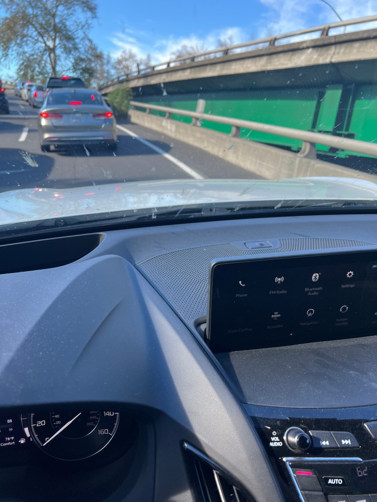That is a shot of us, at a full stop, on the transition ramp between I-5 and I-80. Just out of the picture is Janet, who, in a moment of severe urgency, got out of the car, walked around to the front, dropped down and peed. Right there on the freeway. I took a pic, but she ducked out of sight so quickly, this is all I got. It’s possible a woman from the car on our left saw what was happening, but heck… we’ll never see her again. Lol. When you gotta go…