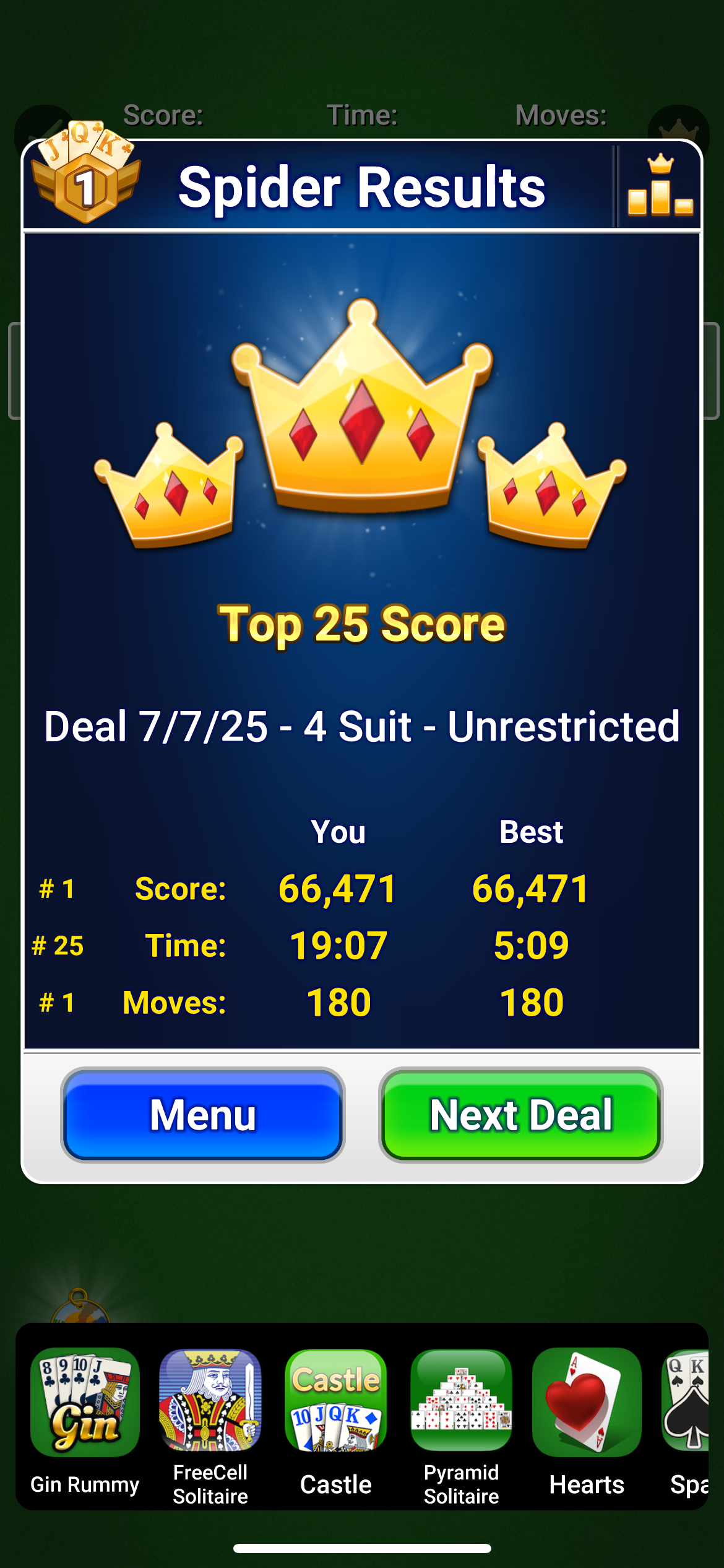 After thousands of Spider games over a decade or two (or somewhere between), I slid right into the #1 slot on a game last night (!).