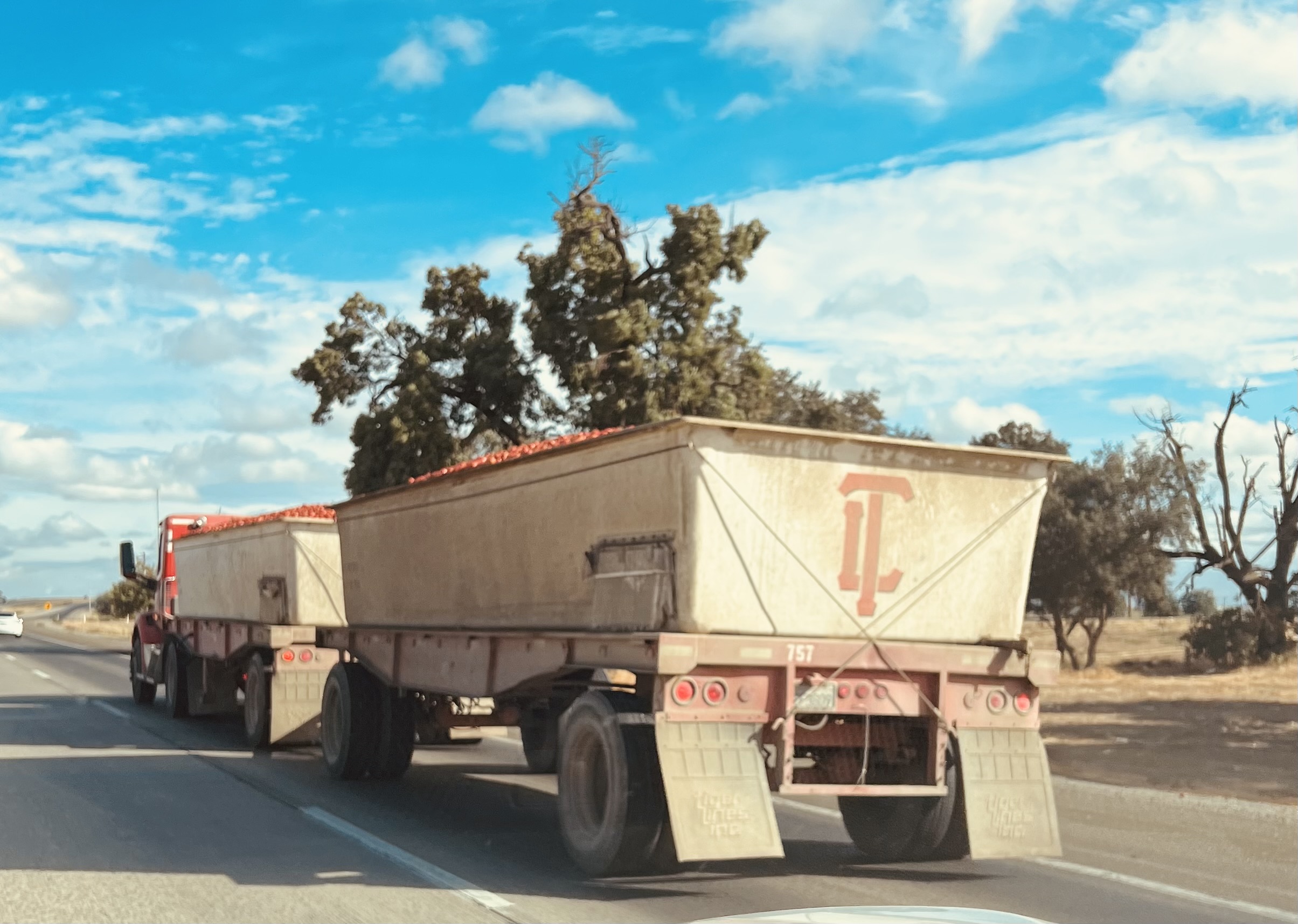 As seen on my drive to Woodland this morning.. a seasonal sign of the times.. one of the last tomato trucks of the season hauling a gazillion tomatoes to slaughter (I presume). With our own Hunts factory being closed, I’m not sure where these are headed (sure Jim will tell me tomorrow).