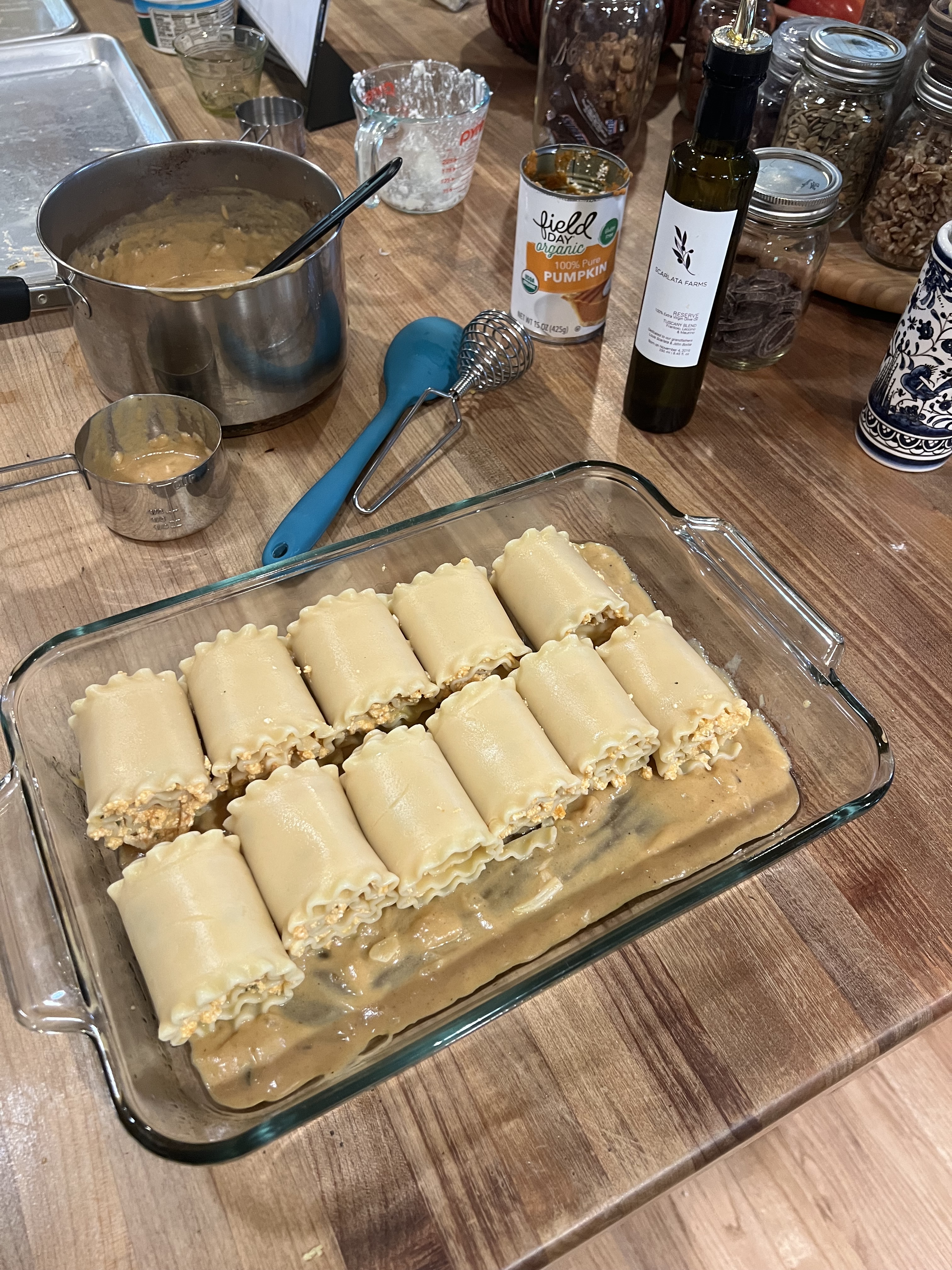 The sauce is onions, garlic, fresh whole sage, pumpkin spices, flour, pumpkin, milk, parmesan, s/p. The filling is ricotta, mozzarella, egg, pumpkin spices, red pepper flakes, s/p. Cook noodles, and then stuff them with the filling. Spread sauce on bottom of dish, lay the stuffed rolls on top, put more sauce on top and then a mix of mozzarella and parm. Bake covered, then uncover to brown.