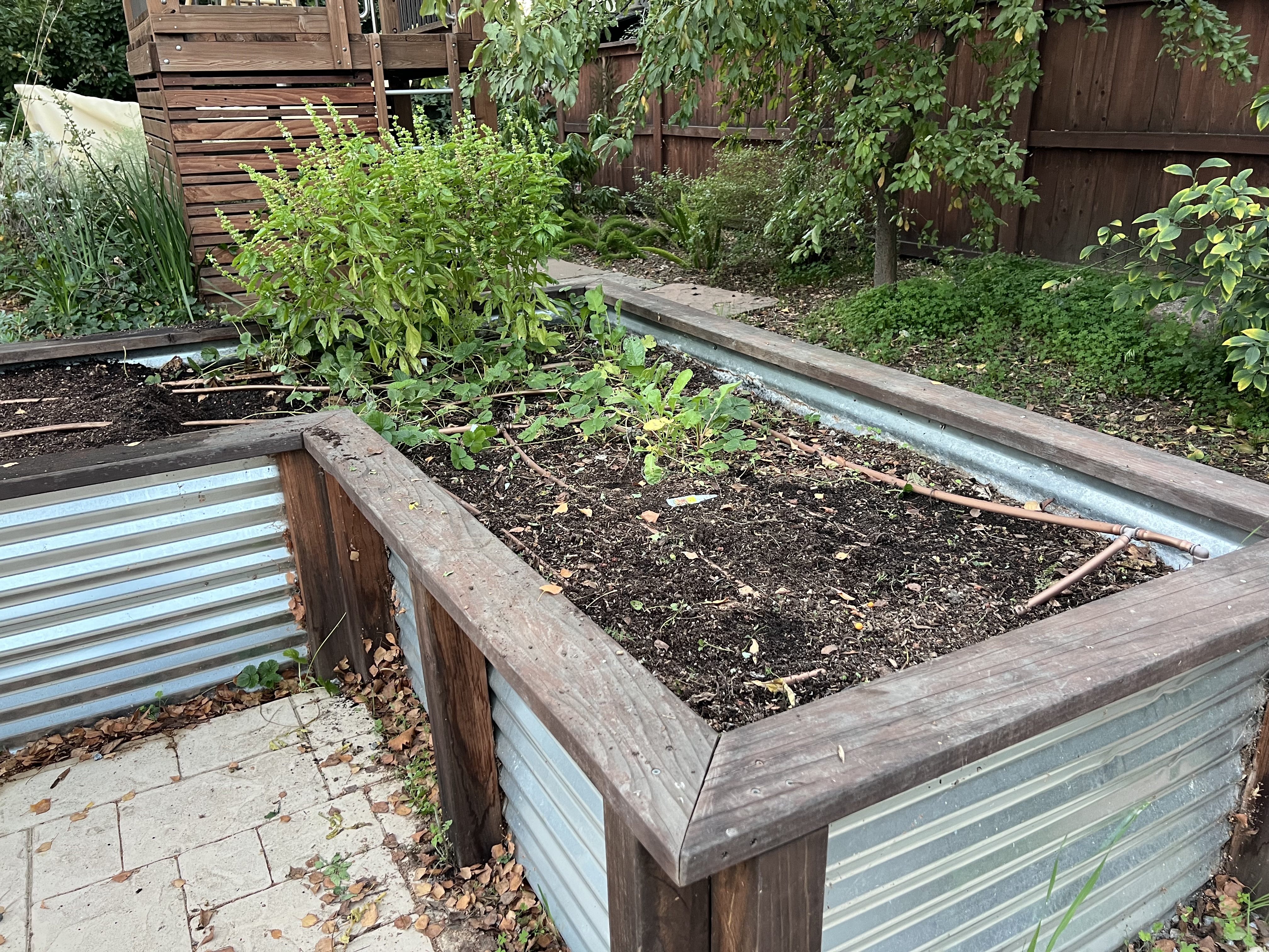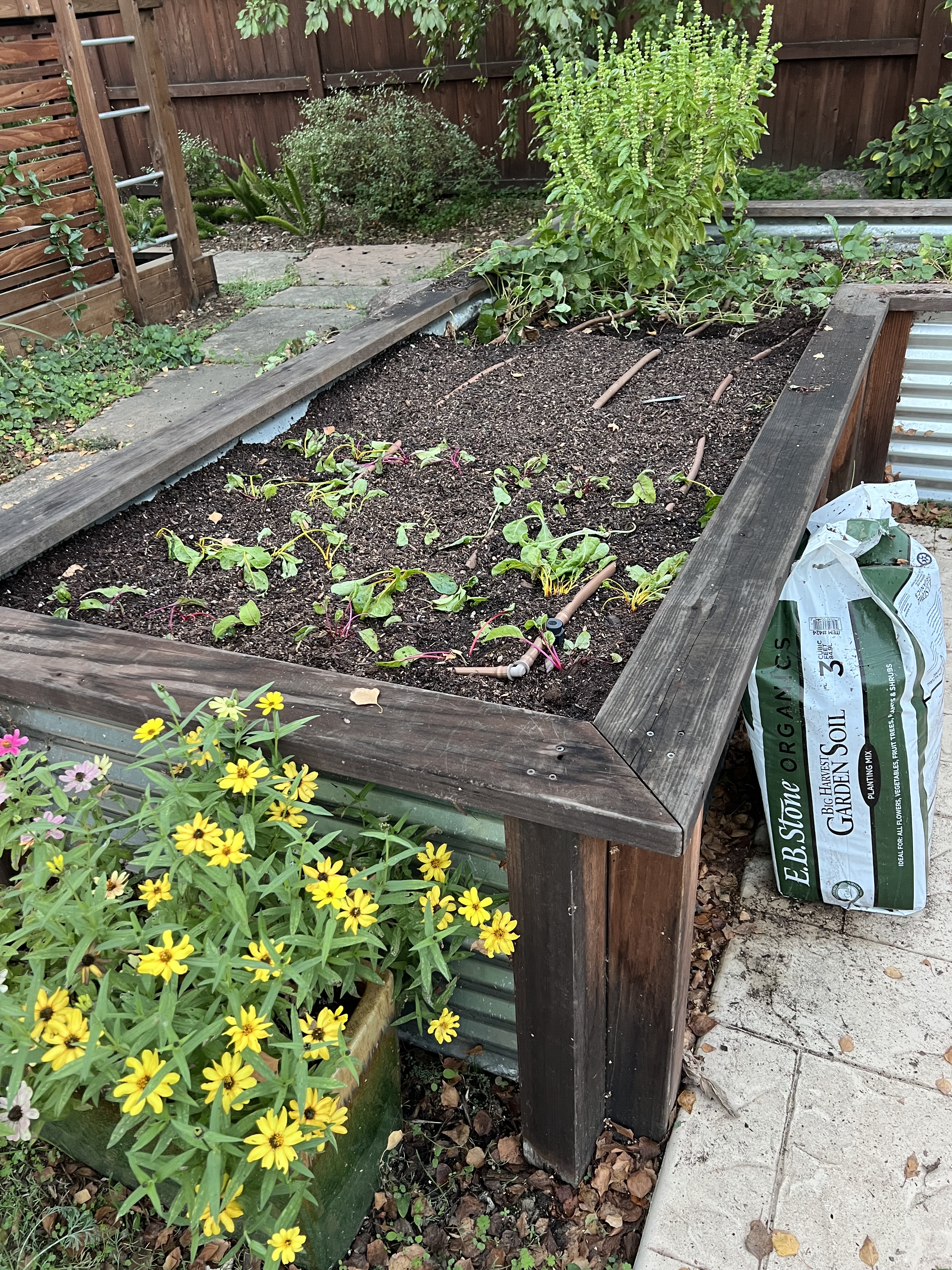 We are a garden in transition. The tomatoes, zucs, eggplant and most of the basil are out. Mary planted lots more chard, thinned the strawberries and added soil. There are a few more things to plant.