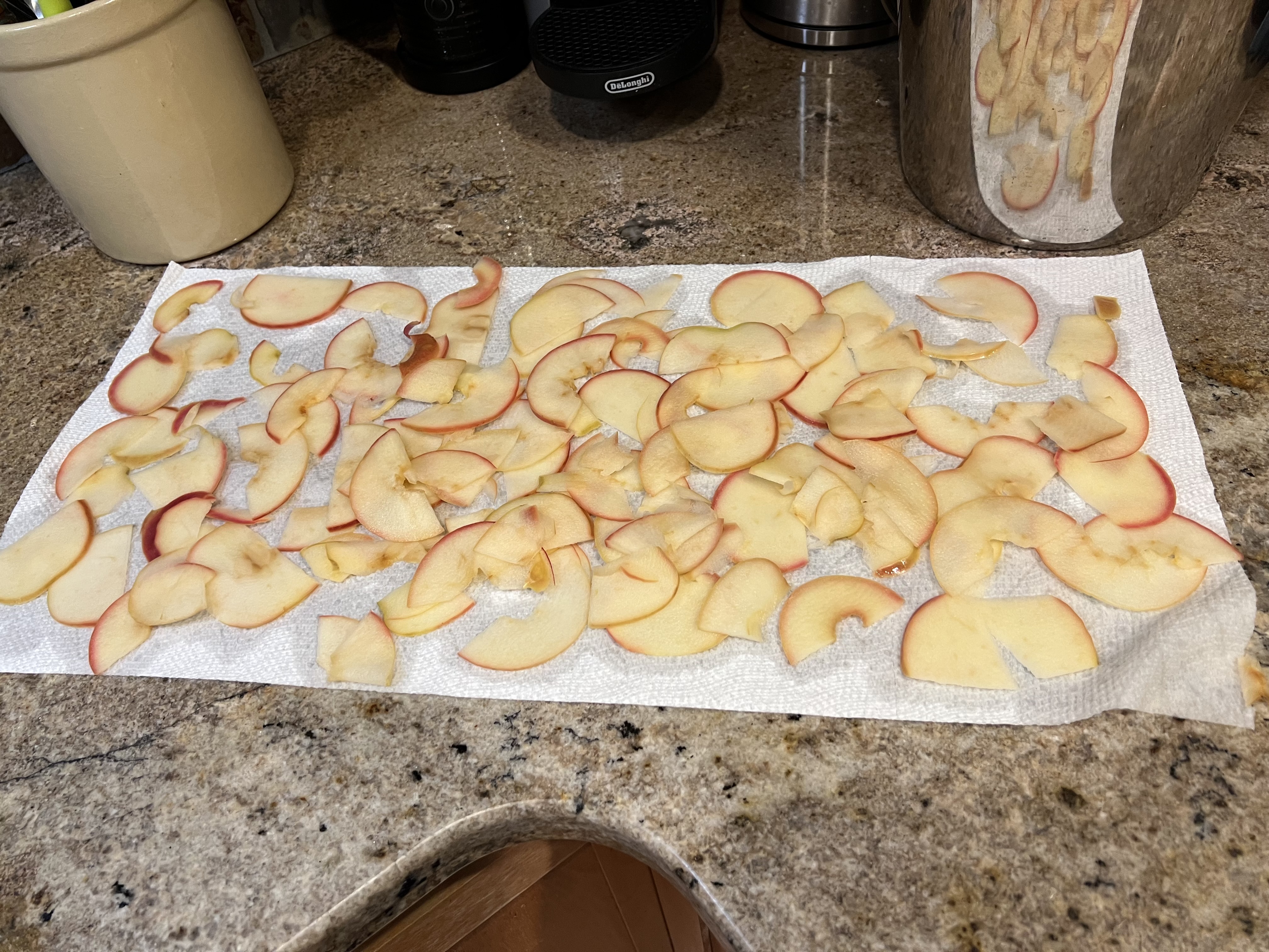 The apples, which have been cut, placed in water and lemon juice and warmed briefly in the microwave, then dried out on a towel.