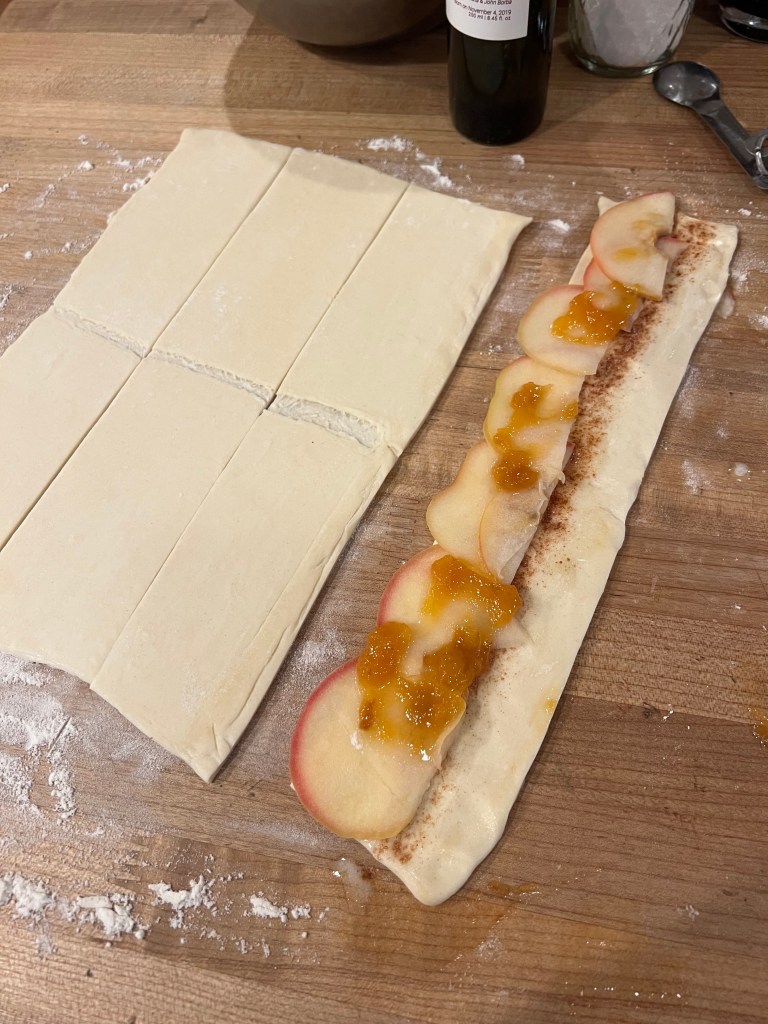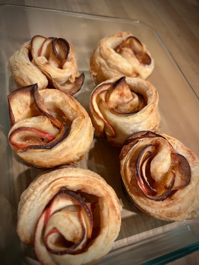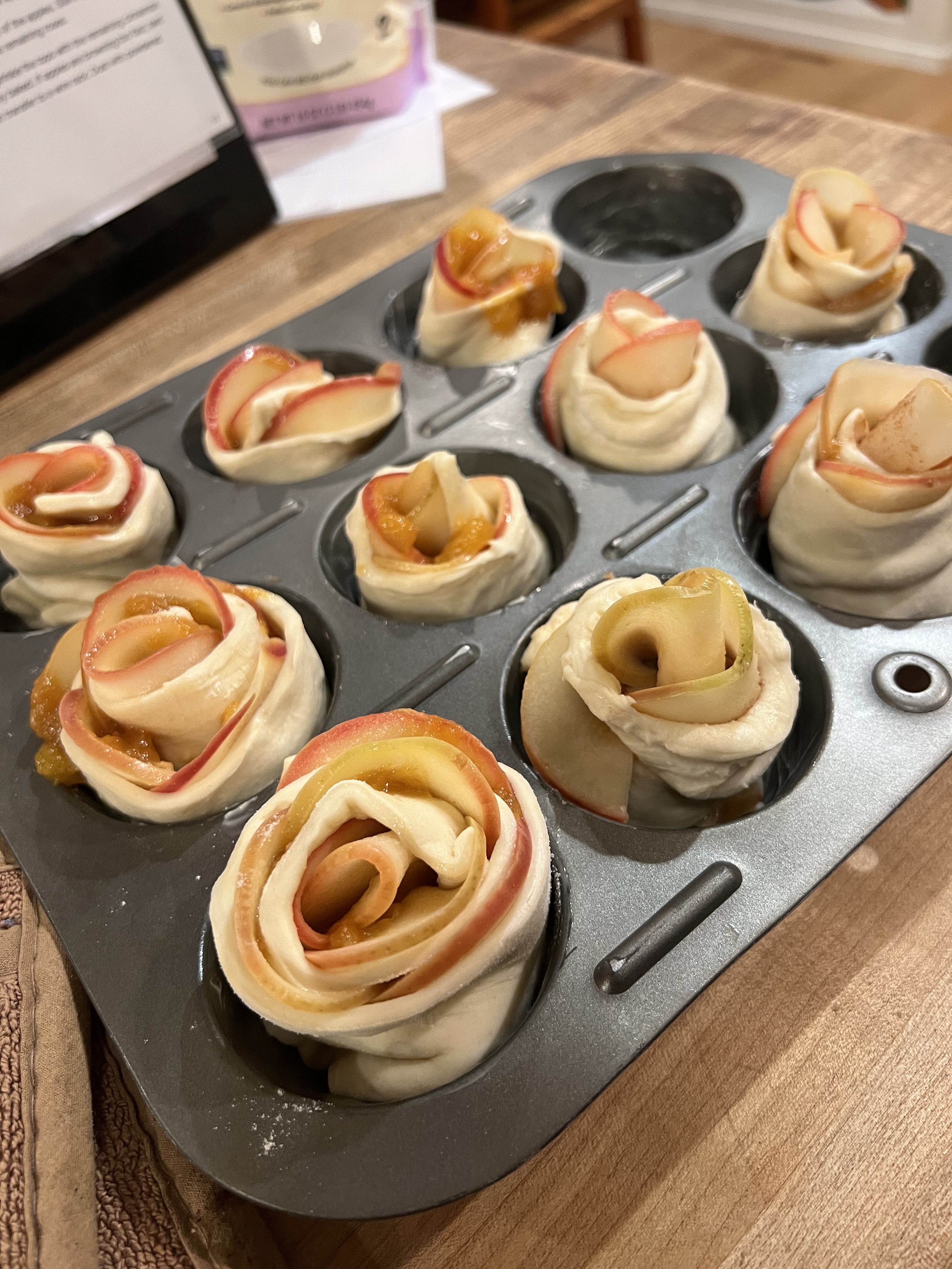 I had an issue. Had I flipped over my recipe to side-B, I’d’ve seen that it called for two sheets of puff pastry. I had only one, so I was working with half the pastry needed. I made that adjustment after the first two roses, yielding two normal sized roses and eight shrimpy ones.
