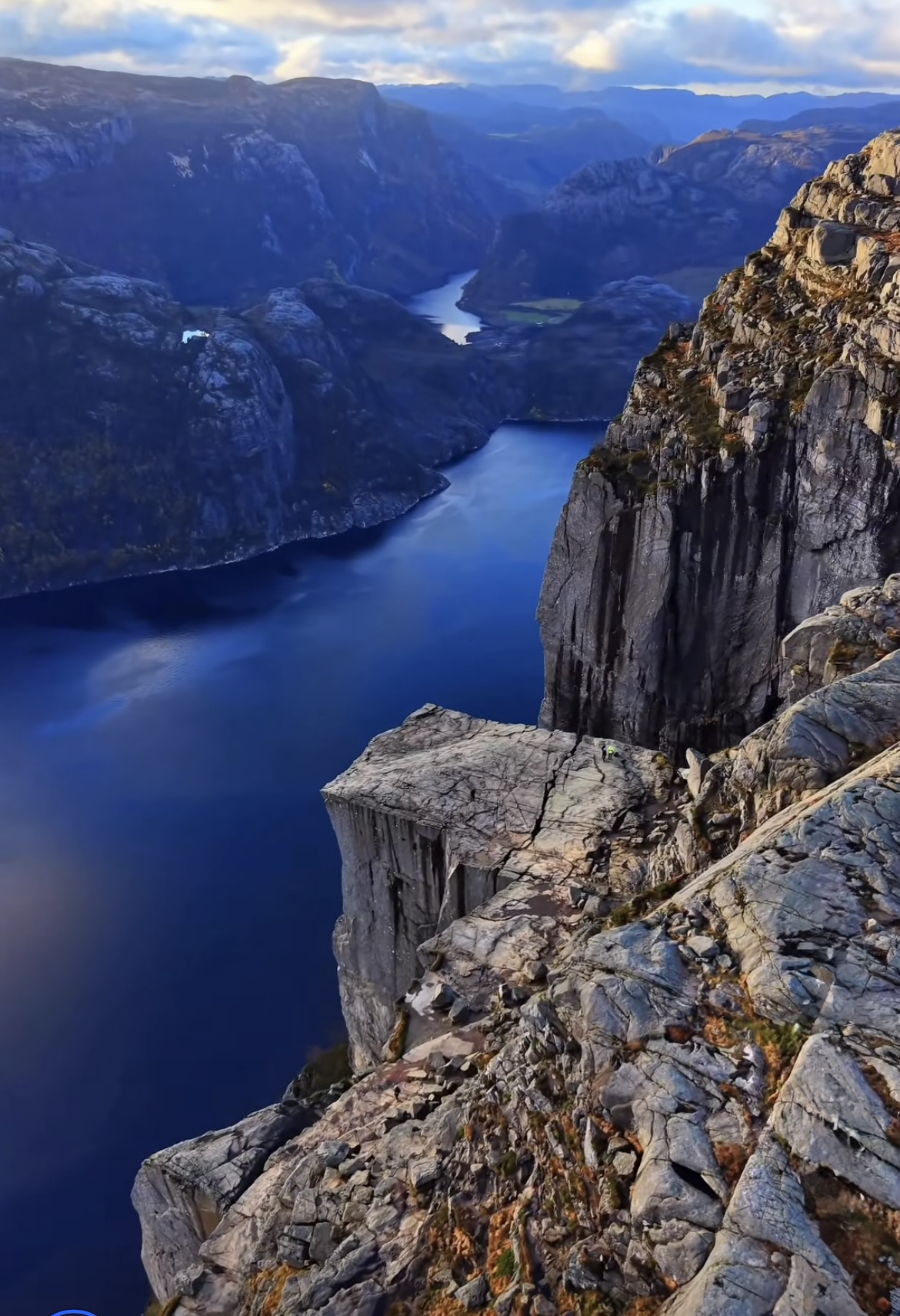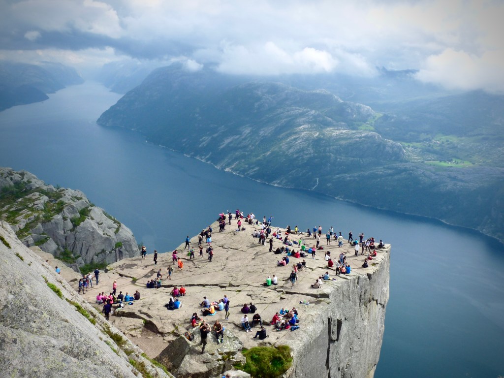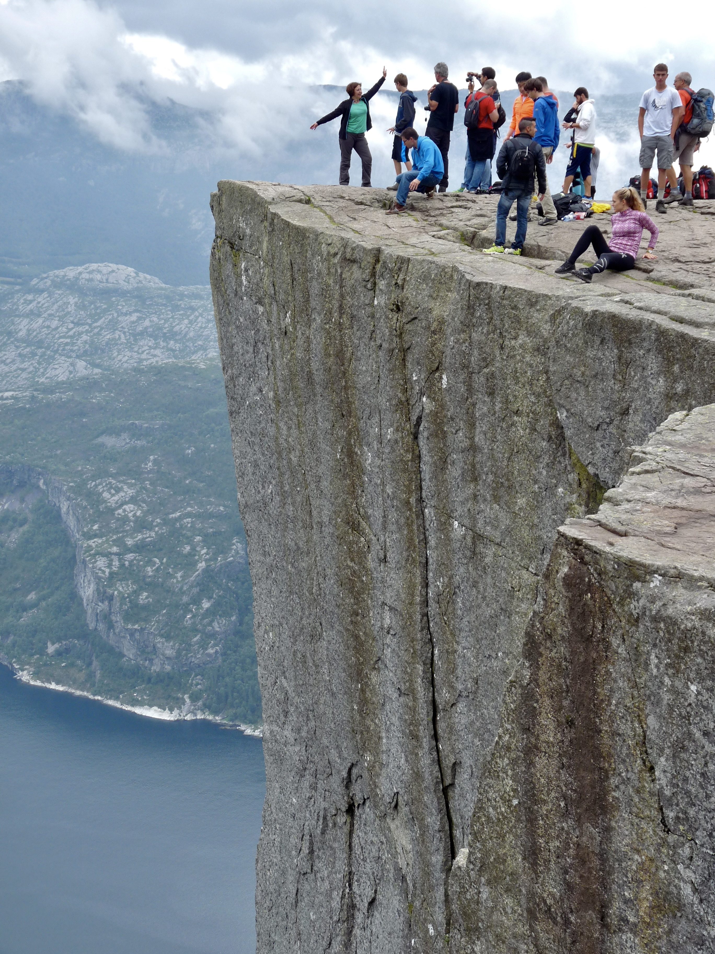 Preikestolen is that massive square section of granite jutting out from the side of the mountain. In the picture on the right you get a bit of context for that structure. The cliff is sheer and rises 2000′ above the water.