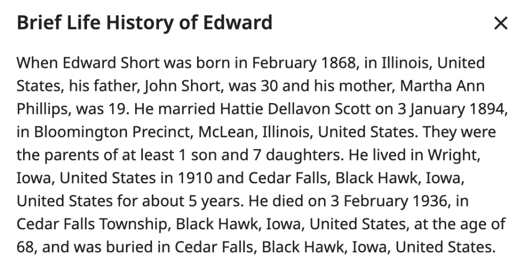 • Edward Short (1868–1936): Buried at Greenwood Cemetery after passing away in Cedar Falls Township.