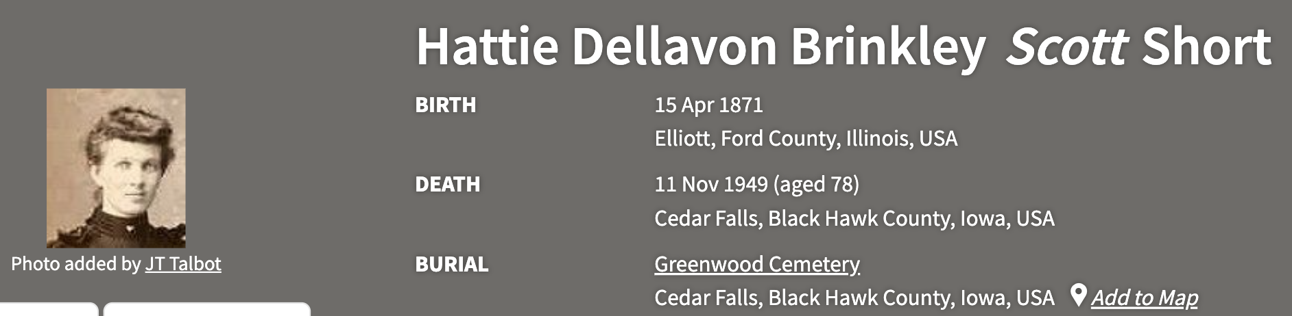 • Hattie Dellavon Brinkley Scott Short (1871–1949): Buried at Greenwood Cemetery.