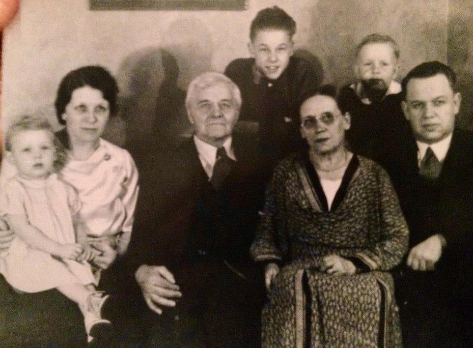From L to R: Aunt Ellie (1932-2019), Grandma Mary (1898-1995), Edward Short (Grandma’s dad, 1868-1936), Uncle Vic (1922-2014), Hattie Short (Grandma’s mom, 1871-1949), dad (1927-2000), Grandpa Pete (1894-1981).