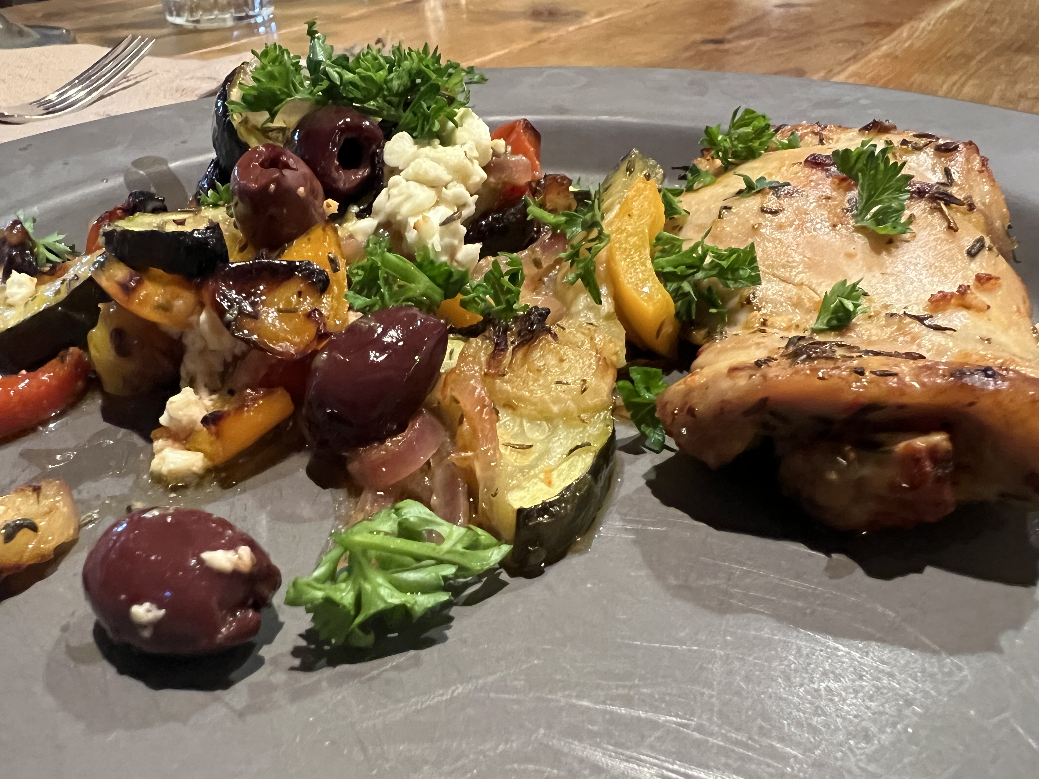 That would be a sheet pan Greek chicken dish. The marinade was the key to this one: olive oil, mustard, lemon juice, salt, garlic, oregano, thyme and lemon pepper. Both the chicken thighs and the veggies (red onion, yellow pepper, cherry tomatoes, zucchini) were tossed in it. After 30 minutes, I added a cup of kalamata olives and a 1/2 cup of feta and returned it to the oven for 10 more minutes. Tossed with garden parsley. So so good.