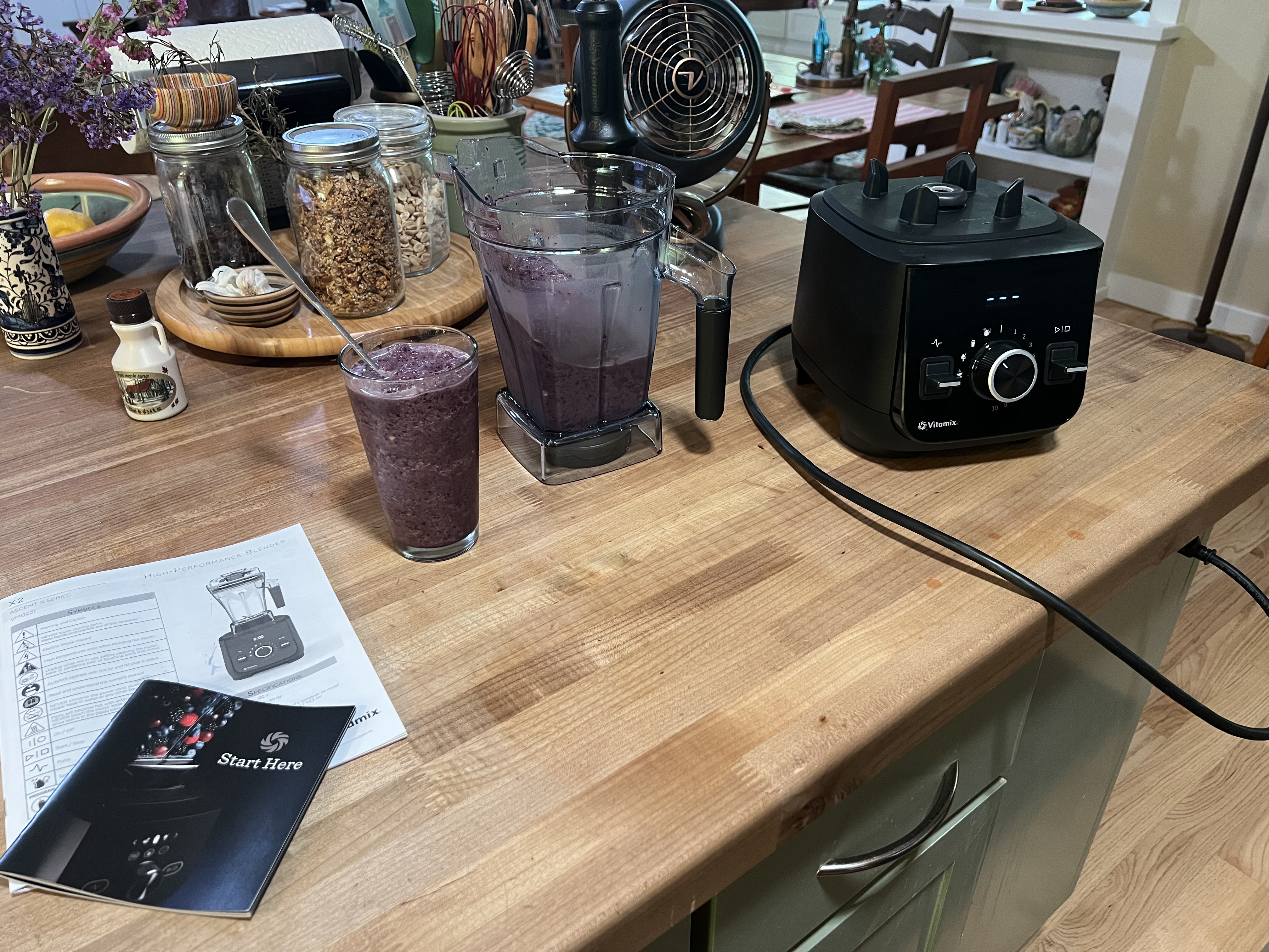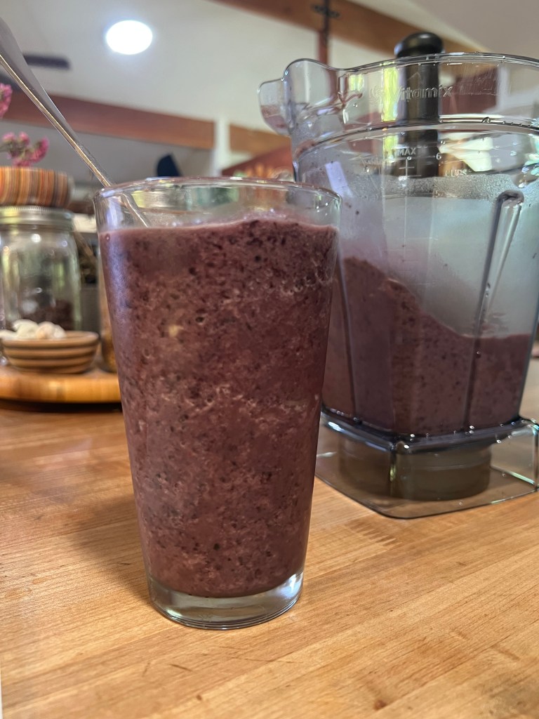 Today was smoofie #3. Same formula for a while now (though they have evolved over the years): 3 cups of ice, 2 cups of water, 1 banana, 1/2 cup of blueberries, 1/2 cup of applesauce, and a large scoop of chocolate protein powder. More or less. For the time being, I’m forgoing the chocolate chips, peanut butter and honey, though I miss those ingredients! Trying to bring my weight back down to normal (and have a long way to go), so being sensible. It still tastes great to me.