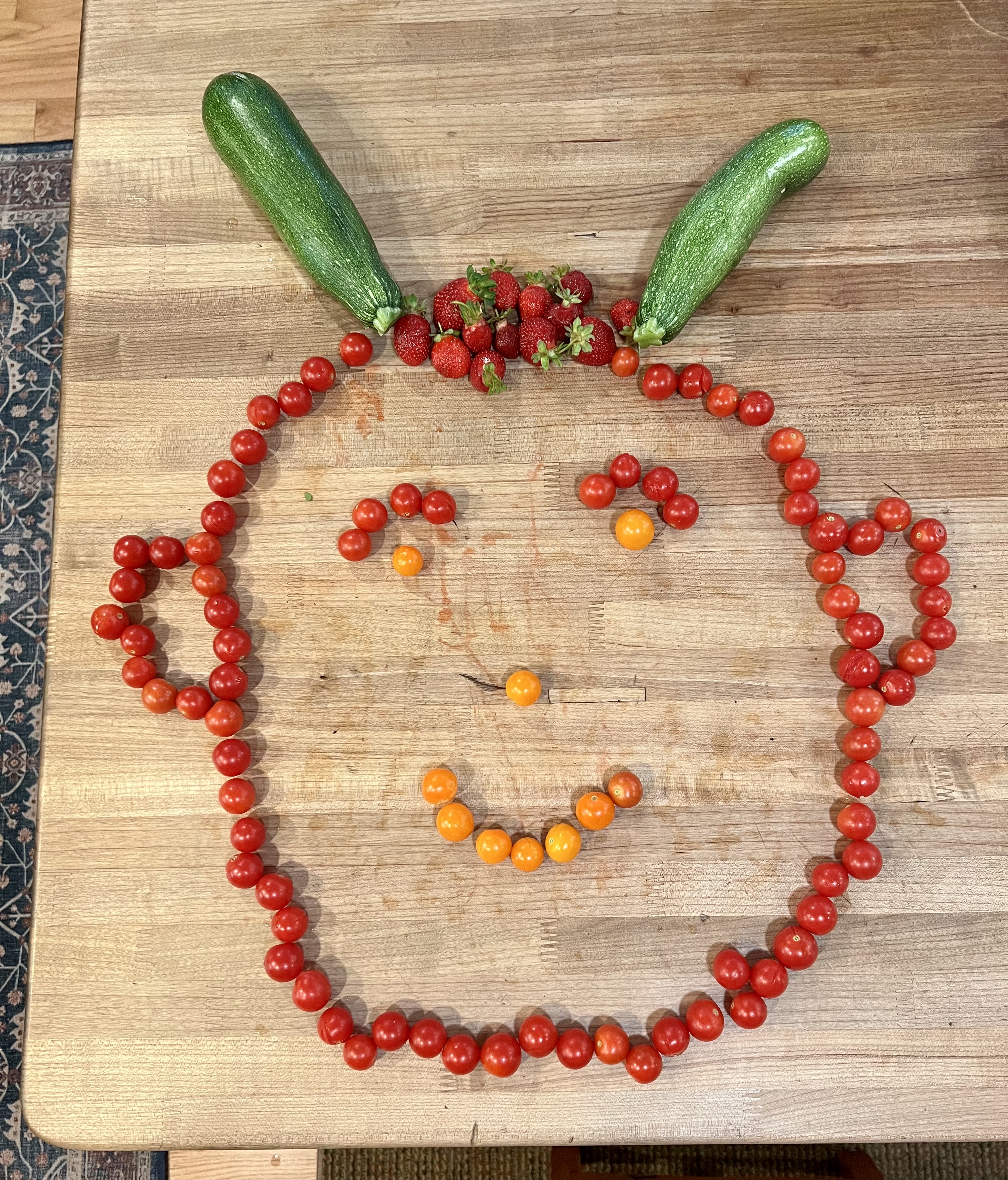 Try not to think about the time it took to form the head with all of those rolly polly cherry tomatoes. But do know, I have fun amusing myself with my garden art. LOL.