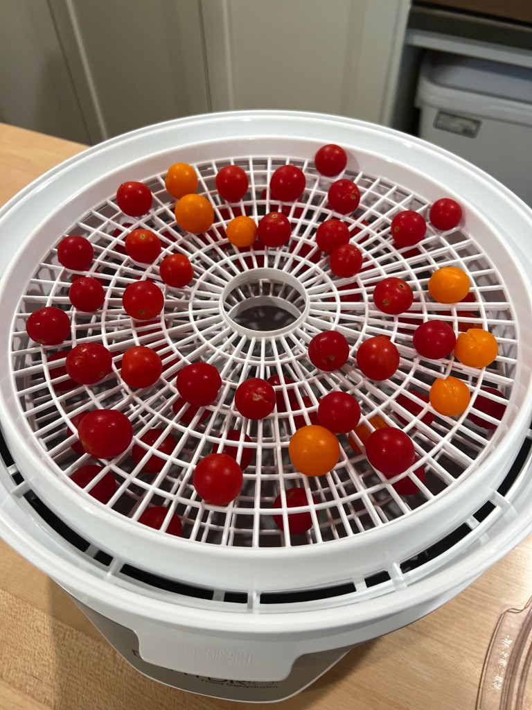 Some do them in the oven at a low temp, which I believe is a lot faster. We’ll see how these go. We’ve done them in the past, but dried them too long and they were hard. Mighta softened in a jar of oil. The summer is young and the tomato plants are prolific; we will experiment.