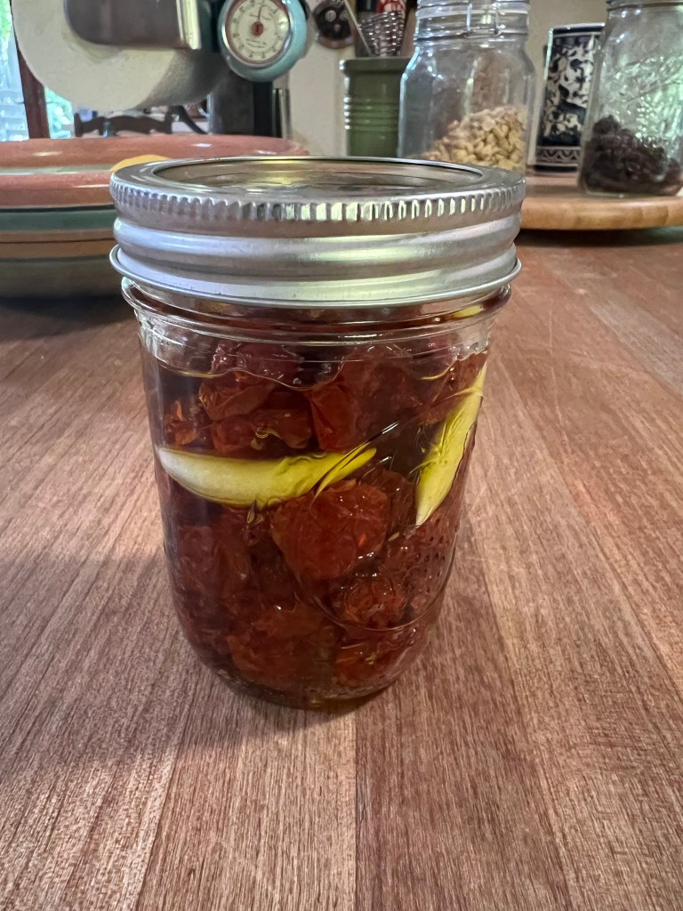 Last night, we dropped a few dozen cherry toms on two trays in the dehydrator. Fourteen and a half hours later, we had these beauties. Wrinkly and still a wee bit soft. Then, into a jar with a couple of garlic cloves, some kosher salt and covered in olive oil.