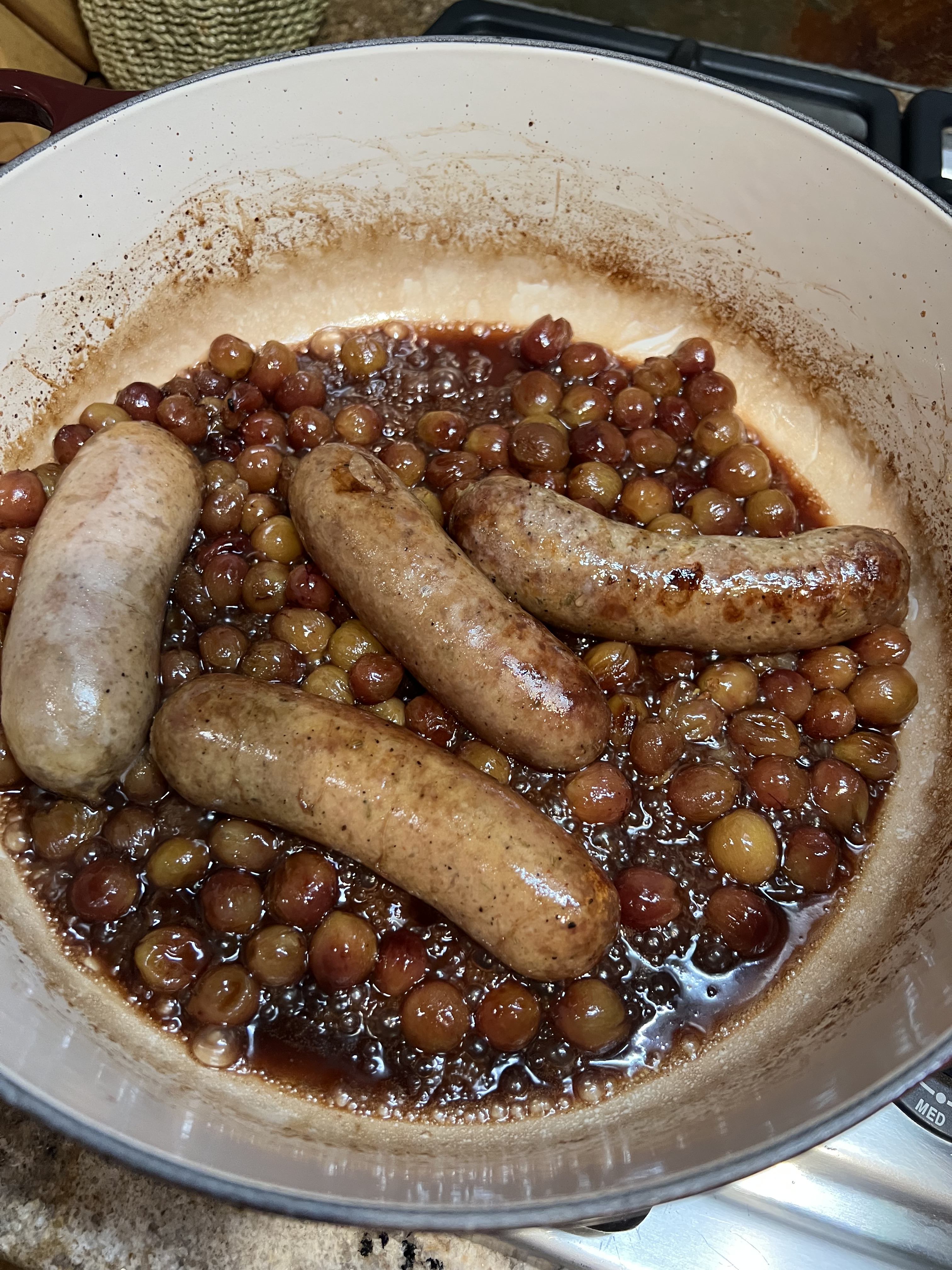 I just found an Ina Garten video where she cooks this dish with the owner of a Providence, RI restaurant, Al Forno. The owner’s been cooking this dish for 30 years, and it’s one of the most enduring on her menu. I was gratified to see that I did exactly what she did. She had no more sauce than I had. Her grapes were bigger and she used both red and green. Her presentation was better (we served from the pot): she placed the sausages around the outside of a platter, piled the grapes in the middle and then surrounded the whole dish with pieces of focaccia (instead of ciabatta). Rustic Italian.