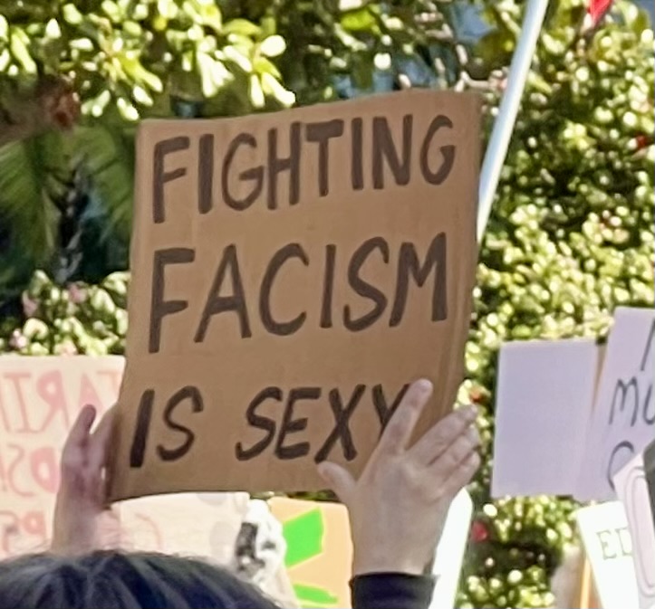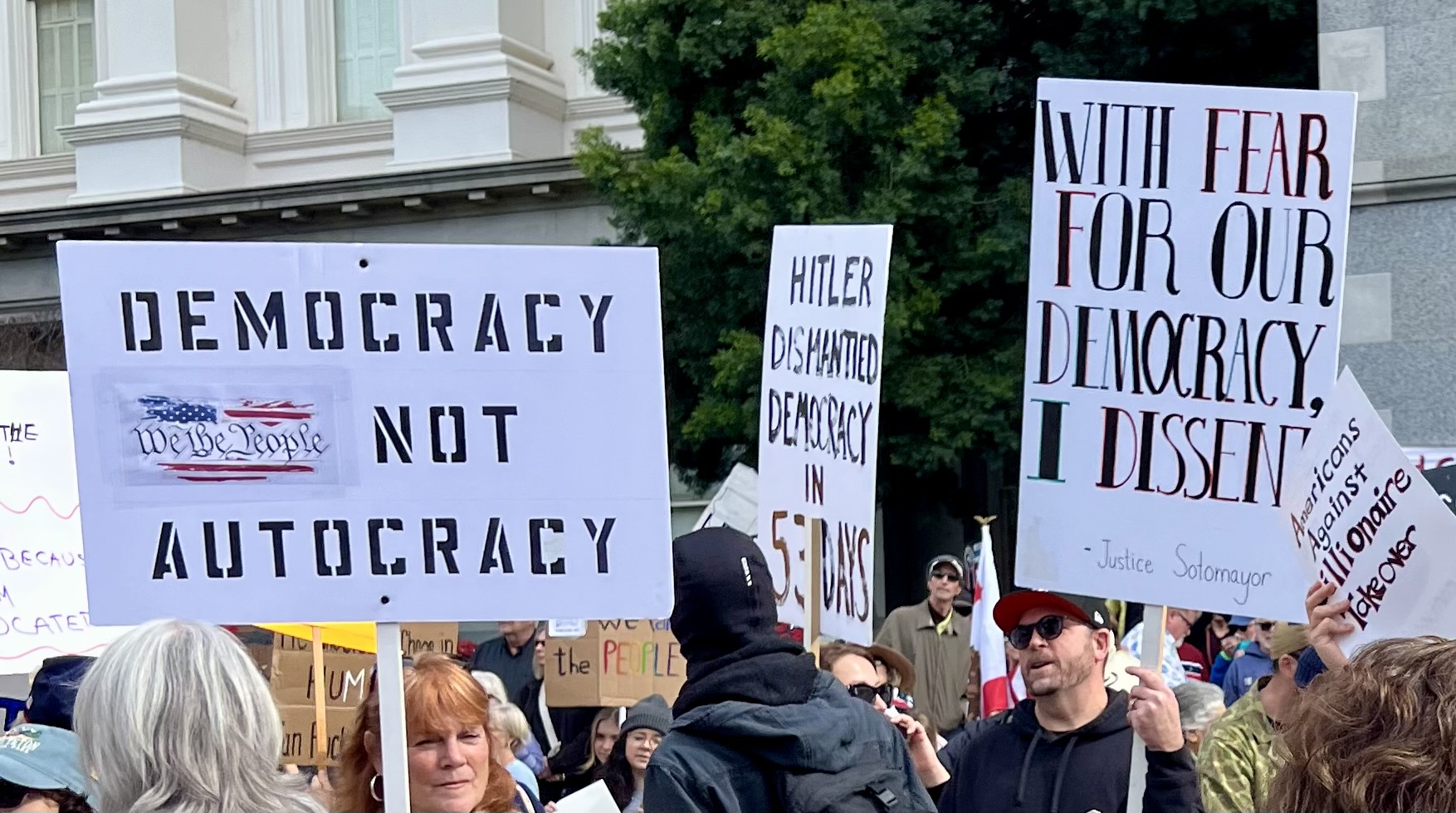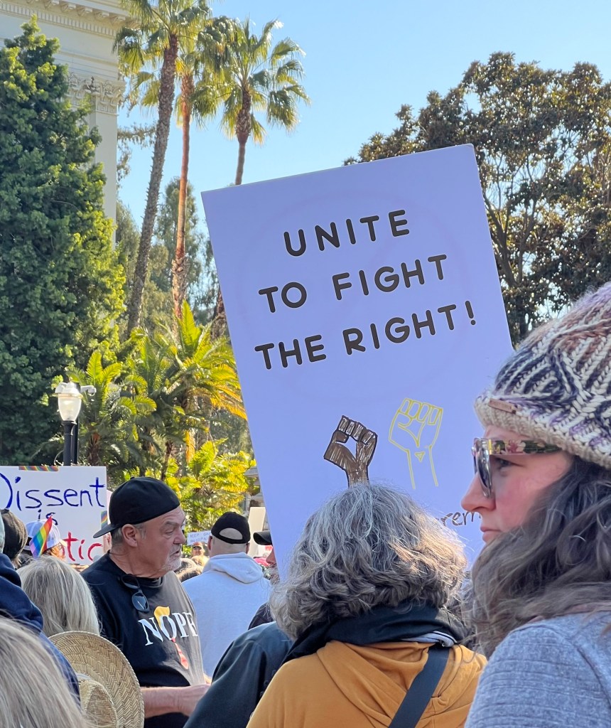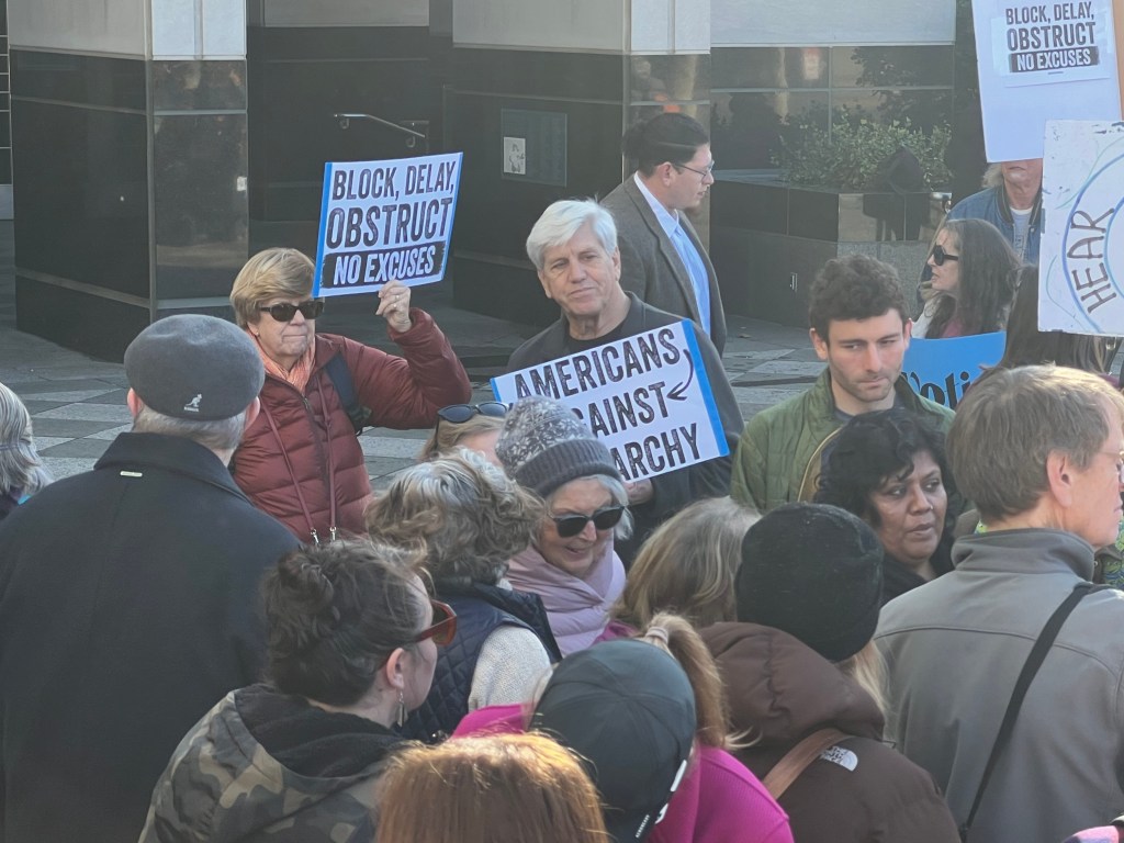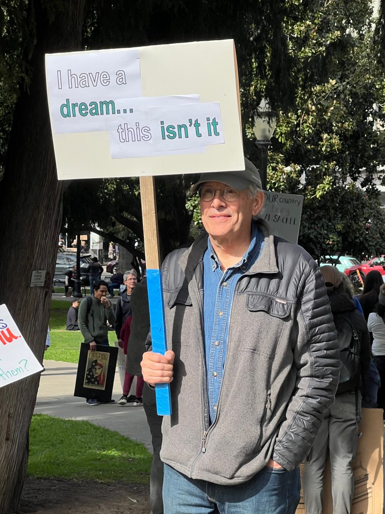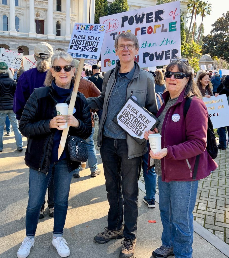 Steve M swung by at 9:30 and we repurposed some signs from marches-past. Then we picked Chris up and headed to the Federal Building at I and 5th in downtown Sac to meet (we hoped) with Senator Padilla’s field staff. We and about 300 others (!) … who, in a matter of days responded to an impromptu call-to-action from a woman in San Diego who stepped up to organize this meeting at the suggestion of Indivisible leaders in that crazy-inspiring Zoom call last Sunday night that drew 53,000 attendees!